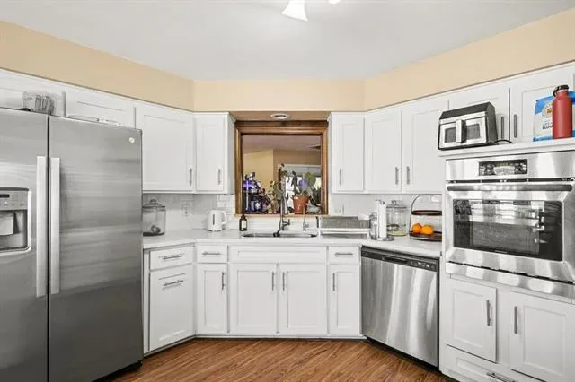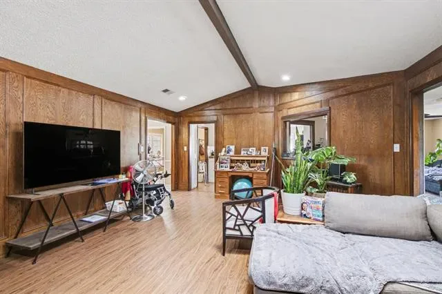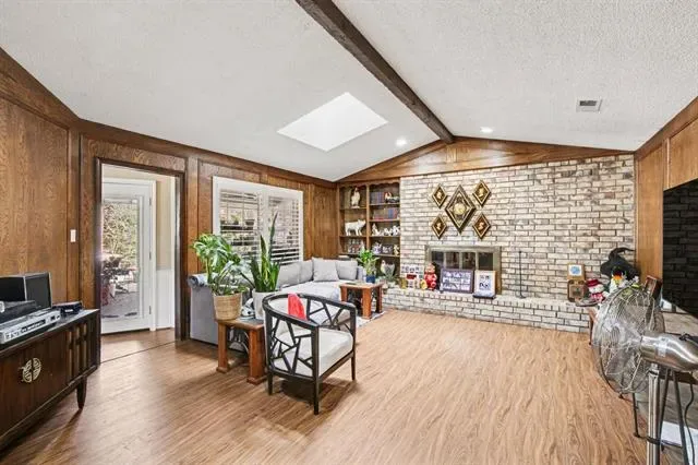 Step inside to discover a cozy living room with a masonry fireplace and rich wood paneling, an oversized den with a wet bar, and a separate dining area — all designed for comfortable living and effortless entertaining. The kitchen is filled with natural light and overlooks the backyard, offering great potential for updates and customization.