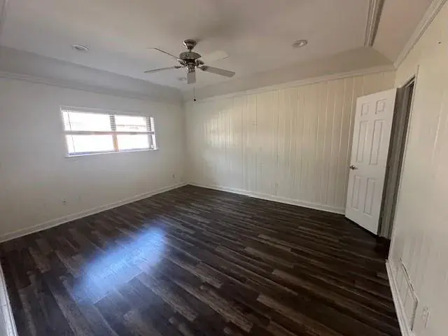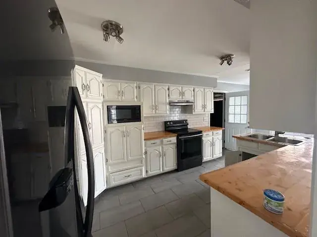 The kitchen provides ample cabinet space, stylish subway tile, and a distinctive butcher block countertop. Each bedroom showcases its own personality with tasteful design details, including real wood accent walls in one. The private primary suite offers a peaceful retreat with generous space and an en-suite bath featuring dual vanities, a separate soaking tub, and walk-in shower.