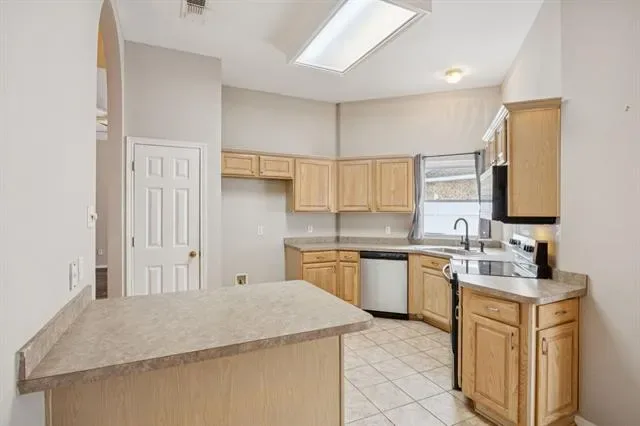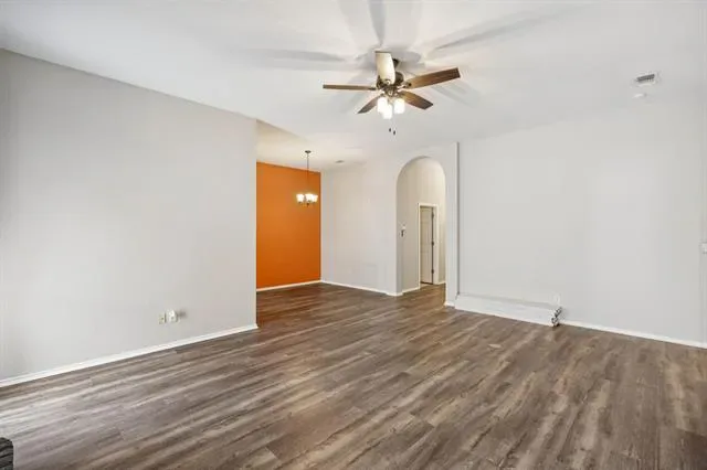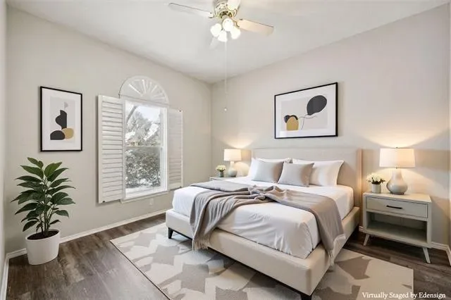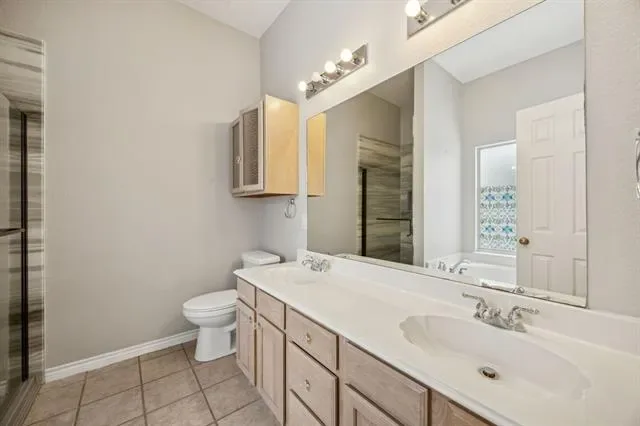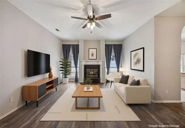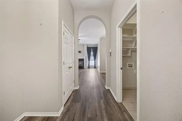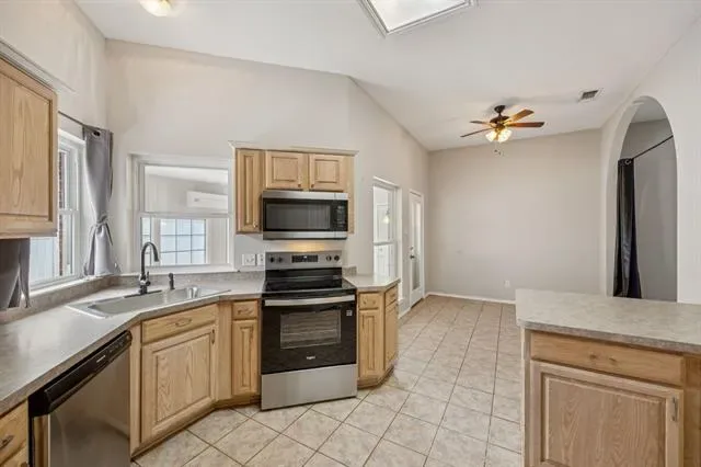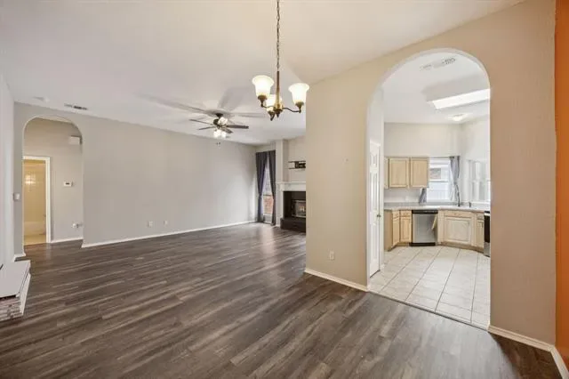 Beautiful move-in-ready single-story home located in the heart of Arlington, TX, in the desirable Woodbine subdivision, perfectly situated on a quiet cul-de-sac and within walking distance to S.J. Stovall Park. This charming 3-bedroom, 2-bath residence welcomes you with luxury laminate wood plank flooring throughout, creating a warm and inviting atmosphere from the moment you step inside. The spacious living room features a stunning brick wood-burning fireplace flanked by large windows that flood the space with natural light, creating the perfect setting for relaxing evenings and entertaining. A generously sized formal dining area sits between the living room and kitchen, offering ample space for hosting family and guests. The updated kitchen showcases an abundance of cabinetry, a walk-in pantry, new stove, dishwasher, kitchen sink, faucet, and sprayer, while a secondary dining area flows seamlessly into the air-conditioned sunroom, providing a versatile second living space accented by a charming brick wall and easy-to-maintain tile flooring. Just beyond the breakfast nook, a bonus room with plantation shutters offers flexibility as a home office, playroom, or additional living area. The private primary suite serves as a true retreat, featuring a recently updated master shower, a relaxing garden tub, and a spacious ensuite layout, while two additional generously sized bedrooms provide comfort for family or guests. Plantation shutters and ceiling fans throughout add timeless elegance and year-round comfort. Step outside to your backyard oasis, complete with an in-ground pool, vinyl fencing, grassy yard, and a spacious storage shed, perfect for outdoor entertaining and keeping tools and equipment organized. Additional highlights include a new hot water heater, a 2020 roof, paid-off solar panels installed in 2020, a prepaid Tesla solar system lease with approximately 15 years remaining, and a transferable HomeShield warranty, completing this truly move-in-ready home.