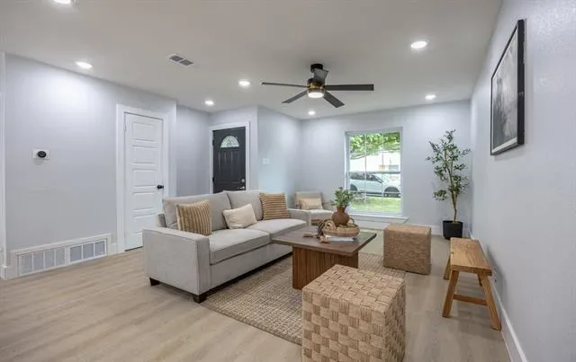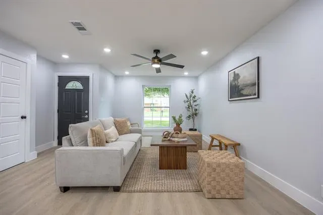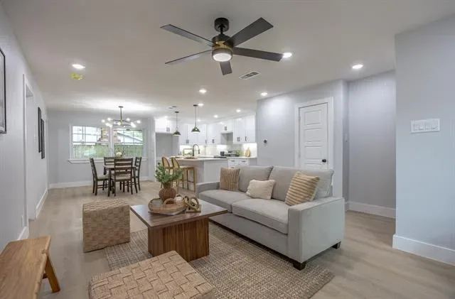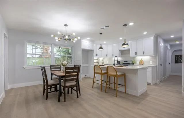 Welcome to this stunning, fully renovated 4-bedroom, 2-bathroom home offering modern finishes and comfortable living in a prime Arlington location. From the moment you arrive, you’ll be greeted by great curb appeal, mature trees, and a fresh, clean exterior design. Step inside to an inviting open concept layout featuring new flooring, recessed lighting, and a bright, airy living space perfect for entertaining. The kitchen is a true highlight, showcasing custom cabinetry, quartz countertops, a large island with seating, stylish pendant lighting, and stainless steel appliances.