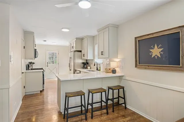 Completely remodeled down to the studs, the home showcases gorgeous wood flooring throughout, a stunning updated kitchen with gas range and all-new appliances, and beautifully renovated bathrooms. Additional upgrades include all new windows and a new hot water heater, offering peace of mind for years to come. Step outside to find exceptional off-street parking for up to 6 vehicles—perfect for hosting larger groups. The converted garage creates a one-of-a-kind entertainment space featuring a pool table, bar area, and plenty of room to relax and gather.