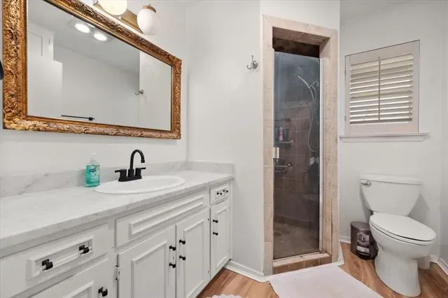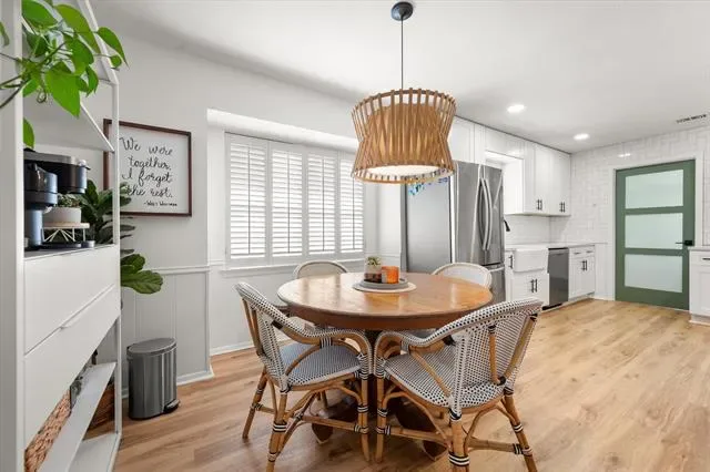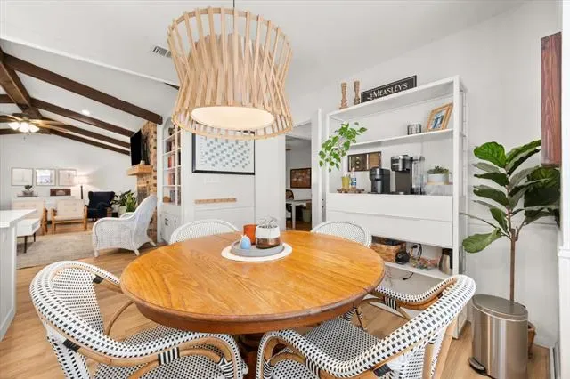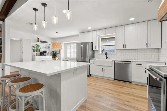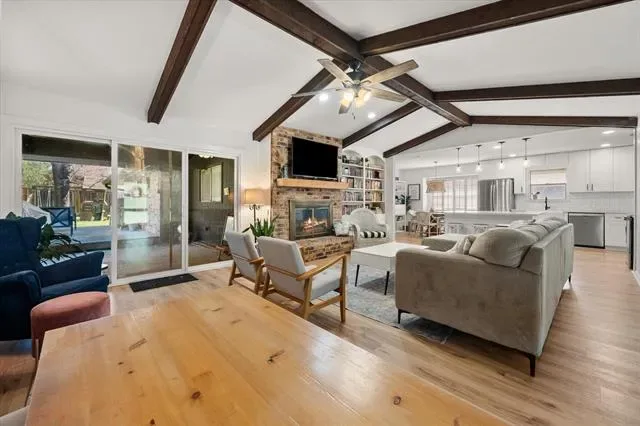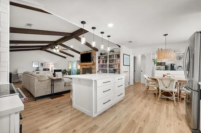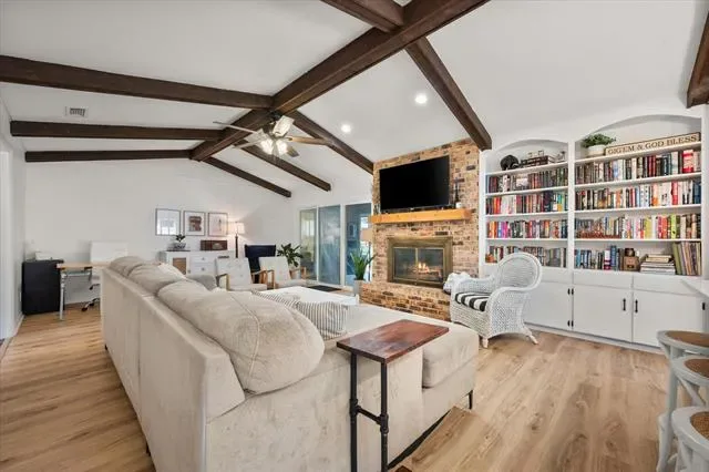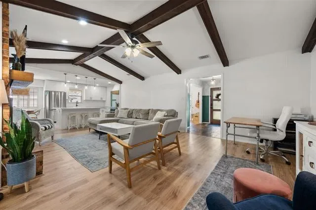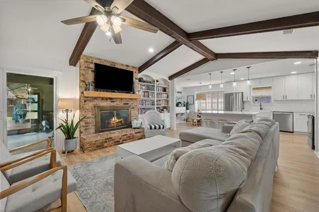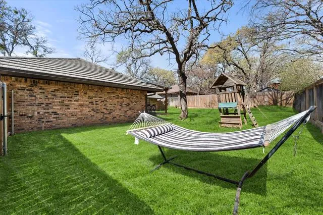This is that special home you’ve been waiting for! Stunning, 4-bedroom home with tons of gorgeous updates in sought after Woodland Park Estates of Arlington, TX. As you approach the home, you’ll be welcomed by the custom wood entry door. The natural stone floor accents the entry leading to a bonus room to one side which could be utilized as an office, additional living space or game room. As you proceed into the home, you’ll be wowed by the vaulted ceiling, massive wood beams and spacious grand room highlighted by the wood burning fireplace and luxurious wood look vinyl plank flooring. The fully remodeled kitchen was opened up to feature a massive island, accented with beautiful quartz countertops which carried throughout the kitchen. The kitchen updates don’t stop there…all cabinets, appliances, lighting, fixtures, and door hardware have been meticulously chosen to complete the fresh, clean look of this functional kitchen. There’s more! Off the kitchen, you’ll find a large space created to serve as a pantry, storage area, office, or a convenient location for your extra fridge or freezer. The dining space is large enough to accommodate a large table, and additional seating is available at the island. On the kitchen side of the home, you’ll also find an ample utility room space and one bedroom with a half bath. The updates in guest bath include quartz counters, fixtures and tub surround as well as dual sinks. The primary bedroom is spacious and has a separate glass sliding door to the covered backyard patio space. If you love to entertain family and friends, the large backyard patio and added wood deck will be the favorite gathering space for everyone! Additional updates to this home will bring peace of mind and added efficiency to the home. These include the entire HVAC system, both water heaters, and improved electrical system. All attic insulation was completely removed and replaced for added home efficiency Schedule your showing today before this one is gone!