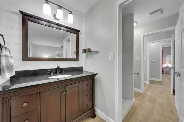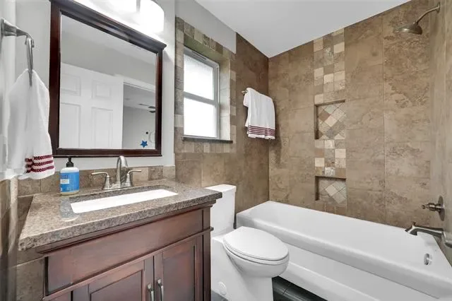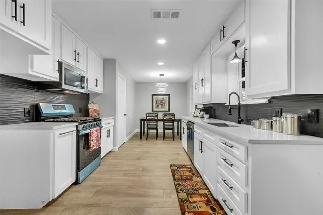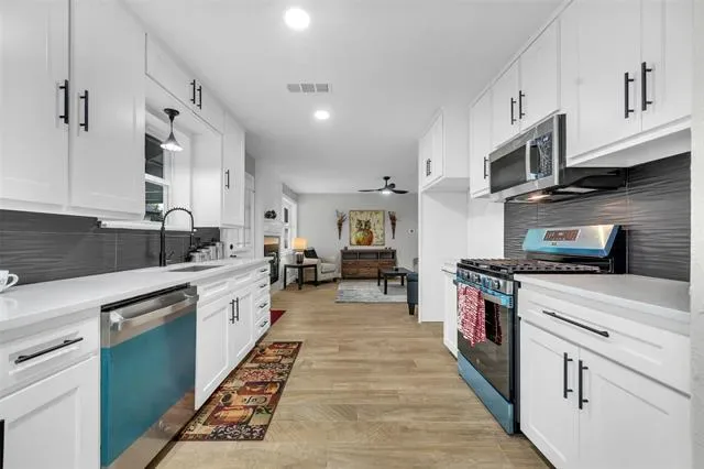 The fully renovated kitchen shines with new quartz countertops, a stylish backsplash, new sink, faucet, garbage disposal, refreshed cabinet fronts and drawers, plus a gas cooktop and convection oven with built-in air fryer. A new dishwasher and microwave complete this impressive space. Gorgeous wood-look tile floors flow seamlessly throughout the home.