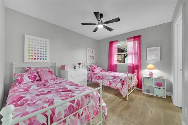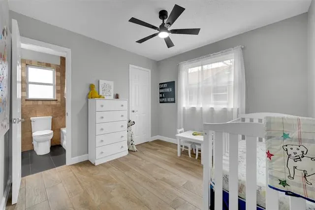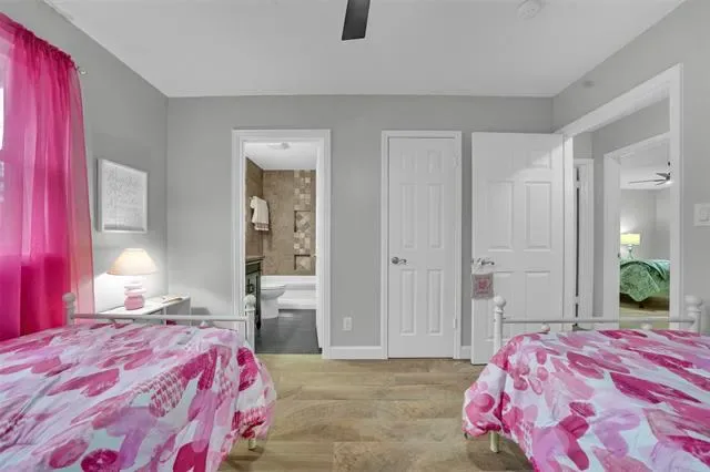 The spacious primary suite offers a large bedroom with double closets and a private bath featuring dual quartz vanities and a separate shower. Two additional bedrooms are connected by a convenient Jack-and-Jill bath, providing both privacy and functionality.