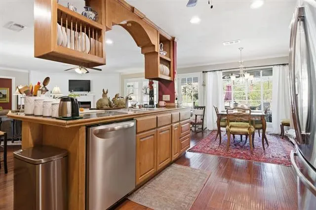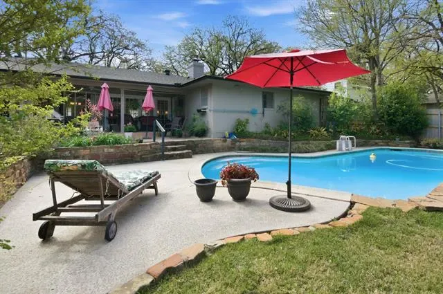 Beautifully maintained ranch-style home in highly desirable Woodland West Estates, nestled among mature trees and offering exceptional curb appeal with painted exterior, classic shutters, and lush landscaping. This versatile 4-bedroom, 3-bathroom layout includes a private in-law suite or second primary—ideal for multi-generational living or guests. Inside, engineered hardwood floors flow throughout, complementing the updated kitchen that opens to spacious living and dining areas perfect for everyday living and entertaining. Enjoy your own backyard retreat featuring a newly resurfaced in-ground gunite pool and a large covered patio for relaxing or hosting. Major updates include a new roof (Feb 2026), HVAC (2019), and water heater (2020), reflecting true pride of ownership. Located in an established community with access to Dottie Lynn Recreation Center, park, playground, pool, and tennis courts, and zoned to highly acclaimed Duff Elementary, Bailey Junior High, and Arlington High School—this home offers the perfect blend of comfort, convenience, and community.