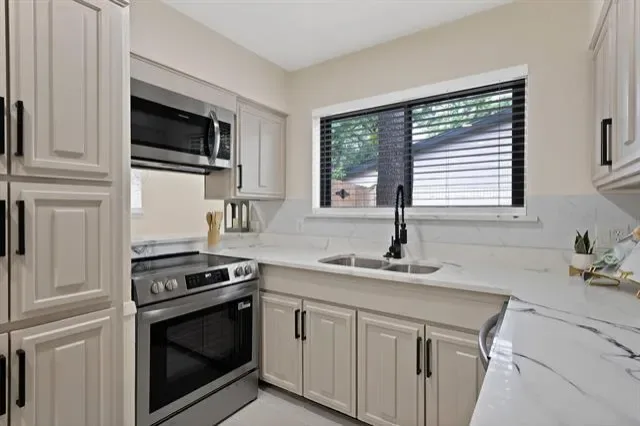 Out back, the large traditional pool is surrounded by a NEW RETAINING WALL, a new pergola, and an outdoor shower. The backyard is a full outdoor living space. The exterior has that sought-after modern look with taupe brick, black trim and a black garage door. New sod and new landscaping complete the curb appeal. The garage features an epoxy floor.