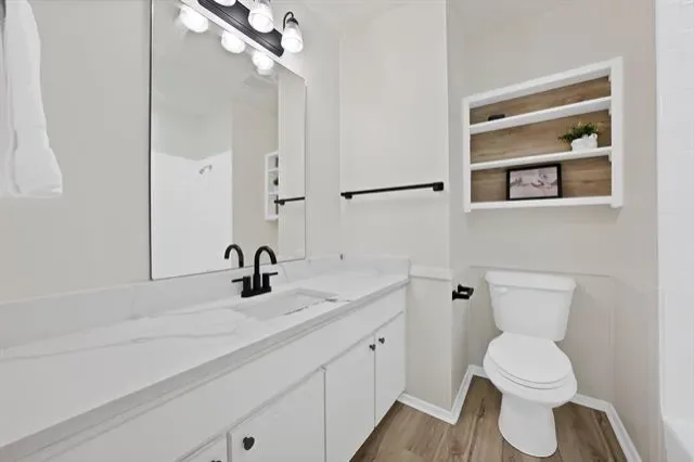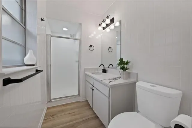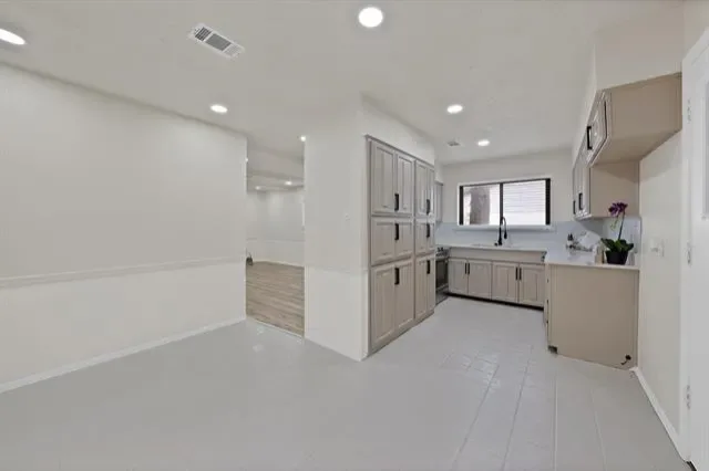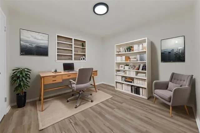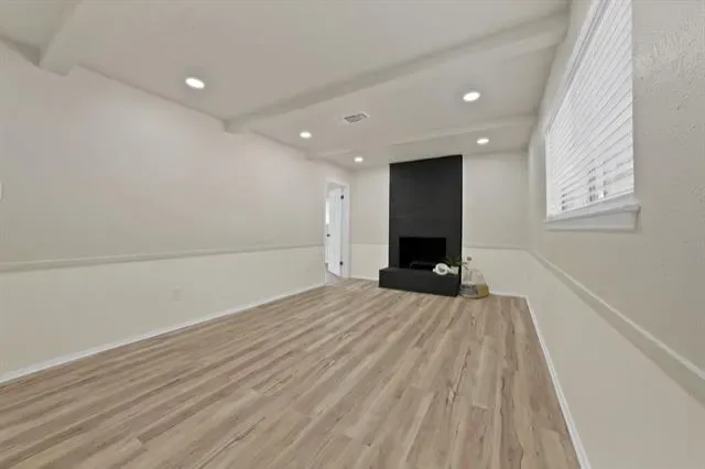 Inside, the renovation is head-to-toe modern. Blonde LUXURY VINYL PLANK floors run throughout. The kitchen features taupe cabinetry, white QUARTZ countertops, black hardware, BRAND NEW APPLIANCES, and a WET BAR. Both bathrooms were updated with quartz countertops, NEW TOILETS, and new fixtures. A sleek black fireplace anchors the main living space, and new recessed lighting was added throughout. Here is a detail you will not find in most homes on this street: the washer and dryer hookups were RELOCATED TO THE GARAGE, converting that kitchen footprint into a DEDICATED PANTRY. Smart.
