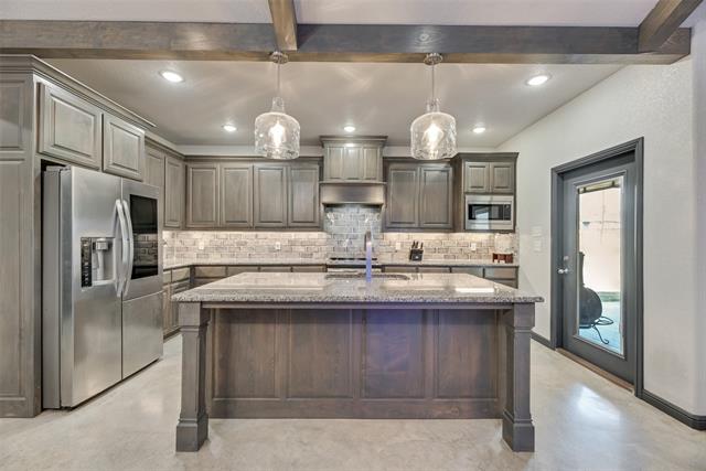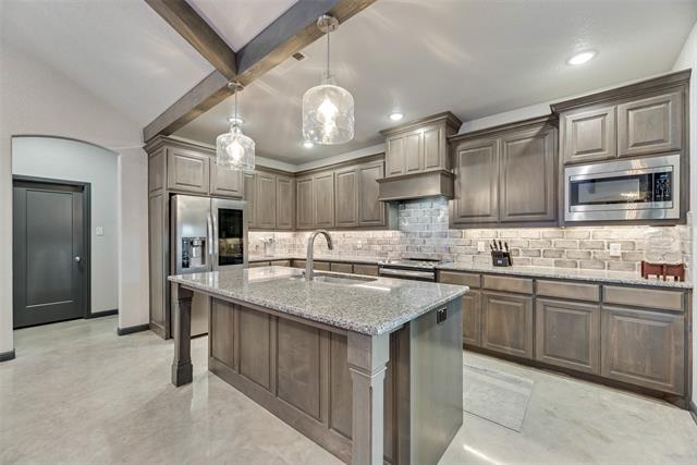 Custom-built 2019 brick home on a 1-acre corner lot in Briar Crossing delivers craftsmanship, comfort, and energy-smart design within minutes of Azle amenities. The single-story 4-bed, 2.5-bath layout spans 2,245 sq ft with an open-concept plan centered on a vaulted great room featuring exposed beams, stained concrete floors, decorative lighting, and a stone wood-burning fireplace. The kitchen pairs granite counters, custom cabinetry, stainless appliances, and a large island for prep and gathering. The private primary suite offers dual vanities, an oversized walk-in shower, and a spacious closet.