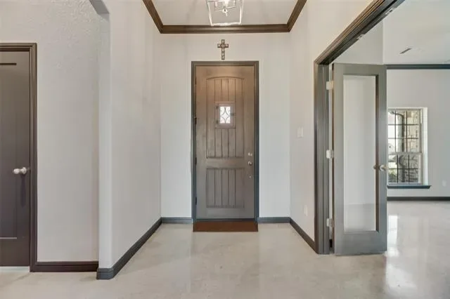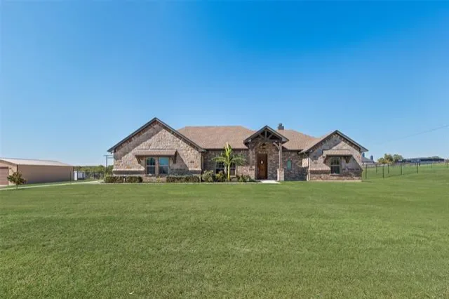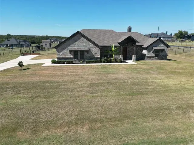 Custom-built 2019 brick home on a 1-acre corner lot in Briar Crossing delivers craftsmanship, comfort, and energy-smart design within minutes of Azle amenities. The single-story 4-bed, 2.5-bath layout spans 2,245 sq ft with an open-concept plan centered on a vaulted great room featuring exposed beams, stained concrete floors, decorative lighting, and a stone wood-burning fireplace. The kitchen pairs granite counters, custom cabinetry, stainless appliances, and a large island for prep and gathering. The private primary suite offers dual vanities, an oversized walk-in shower, and a spacious closet.