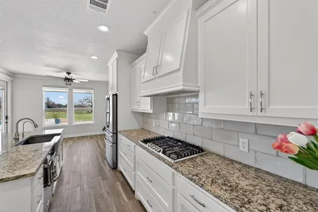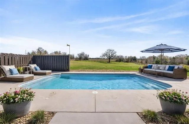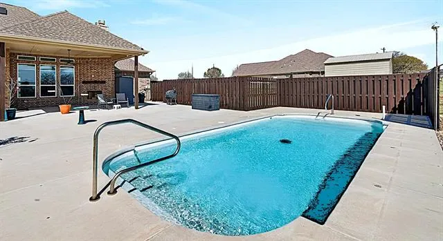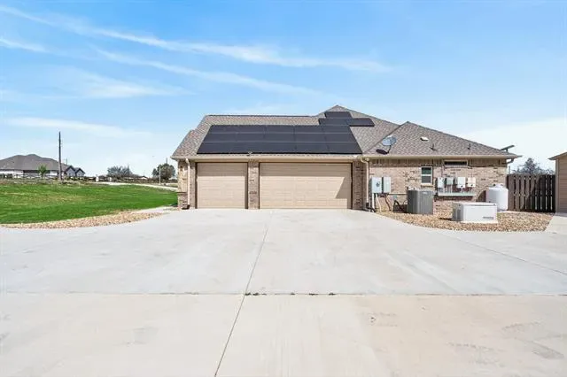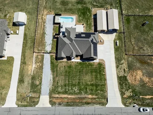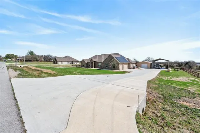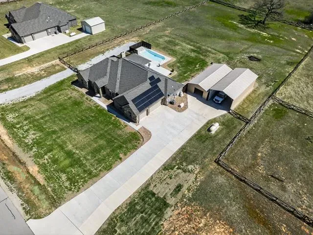 Meticulously maintained like a new home! This property sits on a 1.67-acre lot in a cul-de-sac. No HOA! It features ceiling fans in all 4 bedrooms, a 2nd ensuite bedroom, a separate office, and tons of updates—see attached list. Beautiful open floor plan with gorgeous ceramic tile floors. The kitchen offers plenty of cabinet space for storage and functionality, along with a separate coffee bar in a large walk-in pantry. Enjoy a huge 20’ x 45’ fully insulated metal building with electricity, 2 roll-up doors, and an entry door, built in 2022. There is also a 20’ x 45’ RV storage space with electricity. The property features a beautiful fiberglass pool with deck jets, perfect for relaxing or entertaining. Solar panels were installed in 2023, helping keep electric bills very low. A 165-foot well was also added in 2023, so owners enjoy no water bills. Additional upgrades include a 10-foot sliding gate to the backyard (installed in 2022) and a 10-foot-wide gravel second driveway with backyard access (added in 2025). A whole house water treatment system with reverse osmosis filter was installed in 2023. Oh, and there’s more—the home is equipped with a whole-house generator fueled by a propane tank, capable of keeping the home powered for up to 7 days if needed. The 3-car garage features insulated doors and epoxy flooring. Enjoy both indoor and outdoor fireplaces, plus a spacious outdoor living area. Located just minutes from Eagle Mountain Lake, with easy access to highways, shopping, and restaurants. Don’t miss out on this exceptional home!