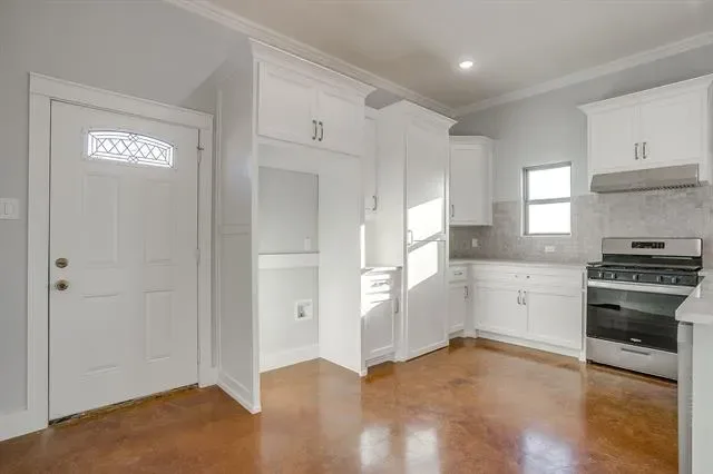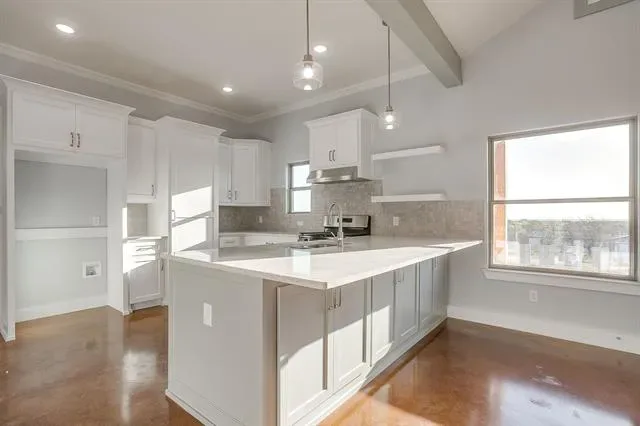Inside, soaring vaulted ceilings with exposed beams and a clerestory window flood the open-concept living space with natural light. Gleaming polished concrete floors anchor the great room, while the chef’s kitchen impresses with white shaker cabinetry, a generous island, tile backsplash, and pendant lighting. French doors open seamlessly to the outdoors.