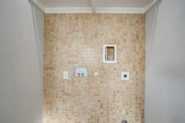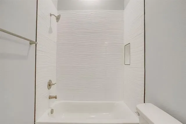 Both baths are beautifully appointed, each featuring a single vanity with quartz countertop, a tub-shower combo, floor-to-ceiling sculptural wave tile with a built-in niche, and brushed nickel fixtures throughout.