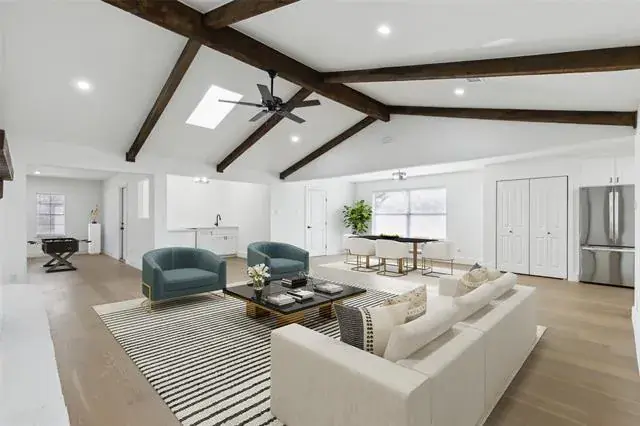 Nestled on a sprawling 10-acre lot behind a gated entrance, this stunning four-bedroom home has been completely remodeled in 2025! Offering a brand-new interior with modern luxury throughout. Just completed and move-in ready, this exceptional property is designed for both comfort and entertaining. Step inside to an impressive living room featuring vaulted, beamed ceilings, a striking white brick fireplace flanked by built-ins, and a stylish wet bar complete with a beverage fridge and sink, perfect for hosting. Rich luxury hardwood floors and crisp white walls create an inviting, contemporary ambiance. The open-concept design seamlessly connects the living, dining, and game areas, making this home ideal for gatherings. The spacious dining area easily accommodates a large table and chairs, while the gourmet kitchen impresses with white cabinetry, all-new stainless steel appliances, including an electric range with a vent, beverage fridge, refrigerator, and dishwasher, plus a sleek white tile backsplash. A generously sized game room opens to the backyard, enhancing the home’s entertainment potential. A full-size utility room with built-in cabinetry adds convenience. Additionally, a private study offers the flexibility to serve as a guest bedroom. The expansive primary suite boasts an en-suite bath with dual vanities, a separate shower, and a walk-in closet. The spacious guest bedrooms ensure comfort for family and visitors alike. Beyond the home, the outdoor space presents endless possibilities. A charming gazebo with a large deck, a storage shed, a barn, and a four-car garage await your creative touch. With this sought-after location and a completely updated home, this estate is a rare find!
