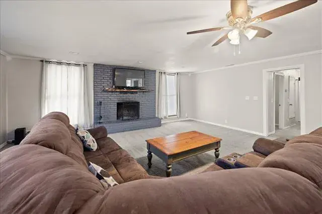 The floor plan showcases a huge living room with a brick wood-burning fireplace, perfect for gatherings, along with a spacious primary suite featuring an oversized walk-in shower. A versatile bonus room offers flexibility as a second living area, dining space, or home office.