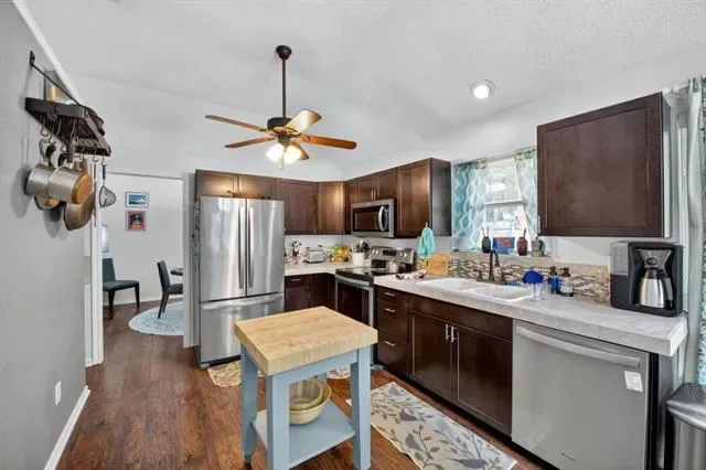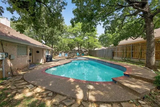 New 16 SEER Energy star AC installed 7-2025 (10-10-5 warranty). Out back a large, sparkling blue pool is waiting for all to enjoy some refreshing fun! Plentifully shade trees, privacy fence, flagstone patio area and bi-level wood deck maximize this spacious backyard’s outdoor living space. Inside the fireplace will keep you cozy when it’s chilly outside. Kitchen was fully remodeled in 2015 with new cabinets galore, countertops, sinks, backsplash, flooring, dine-in island added wi butcher block top and storage below, new paint, lighting, ceiling fan and upgraded Whirlpool appliances in 2016. In 2014 guest bath (and laundry) were updated with paint, tile floor, extra storage, new toilets in both baths, Master ensuite bath fully remodeled with dual vanities, tiled walk-in shower big enough for 2, oversized porcelain-on-cast iron clawfoot soaking tub that will stay hot for long soaks, ceiling fan and mirrors added, tile floor. Flooring, paint, light fixtures and ceiling fans were updated in Master bedroom, living and dining rooms in 2015' guest bedrooms painted 2021. 10’ ceilings create a spacious, airy ambience with 16 windows in 7 main rooms to provide abundant natural light. The sprinkler system simplifies lawn care and home has a large corner lot. Others at this price point and size don’t compare. This home is special and deserves to be seen in person.