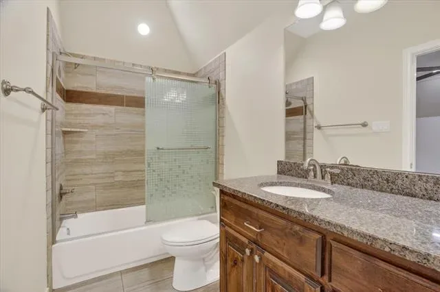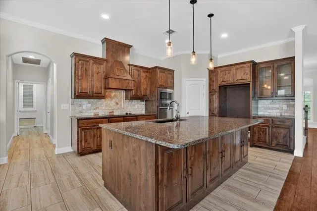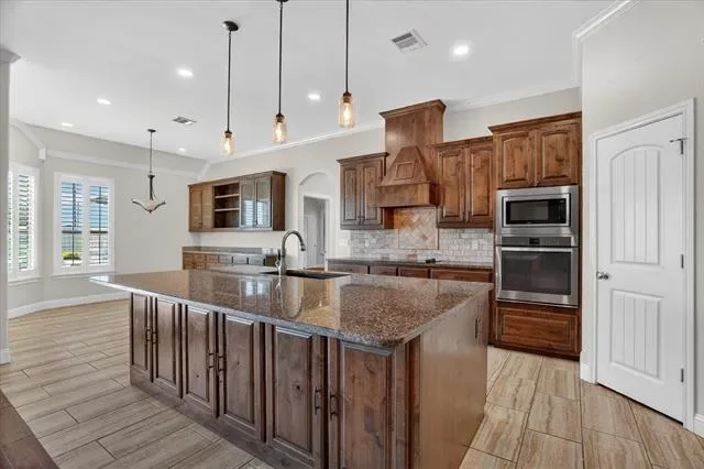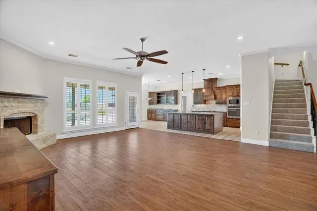 Inside, the open-concept layout includes a spacious kitchen with a large island, custom cabinetry, and granite countertops, flowing into a comfortable living area with a wood-burning fireplace. The home offers a primary suite on the main level, along with an additional upstairs suite—ideal for guests or multi-generational living.