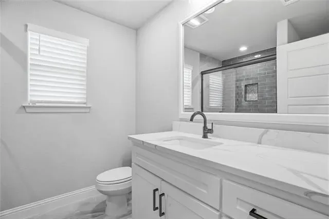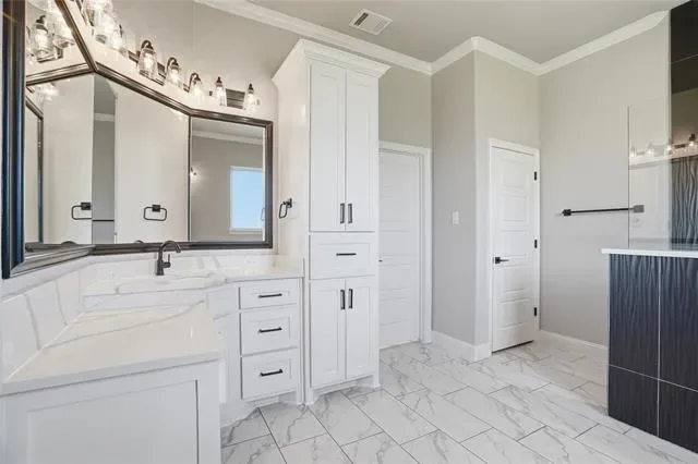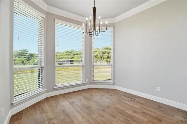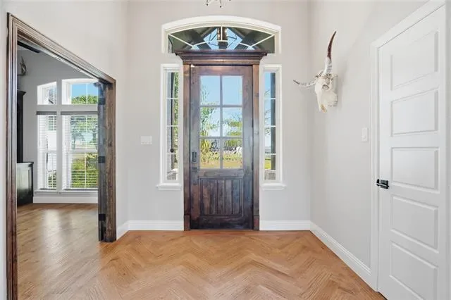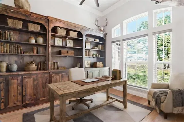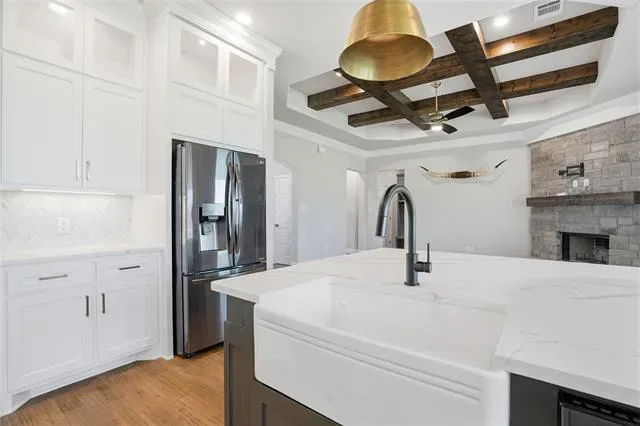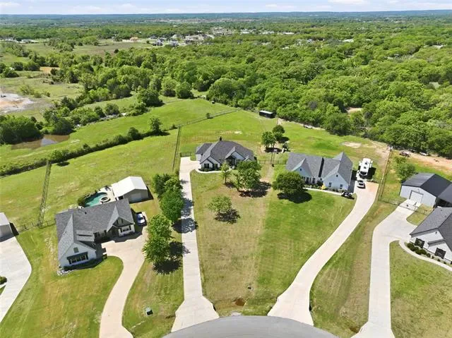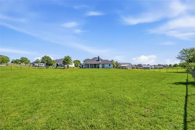 Escape to your own private 1.21 acre sanctuary where modern luxury meets the tranquility of country living just minutes from the city. This sprawling estate makes a grand first impression with a stunning herringbone wood entry that flows into extensive hand-scraped wood flooring and an open-concept layout designed for seamless entertaining. The heart of the home is a sophisticated chef’s kitchen featuring gleaming quartz countertops, a designer farmhouse sink, stainless steel appliances with double wall ovens, and a large central island. Elegant upper display cabinets with accent lighting and under-cabinet illumination perfectly complement the decorative lighting throughout. The inviting living area boasts an impressive coffered ceiling and a floor-to-ceiling stone fireplace, creating a warm focal point for cozy evenings. Work from home in the executive office behind glass French doors, featuring a wall of custom built-ins. The primary suite is a true retreat, showcasing a bold accent wall, remote-controlled blackout shades, and a massive walk-in closet with built-in organization. Relax in the spa-like ensuite bath, which offers separate quartz vanities, a deep clawfoot tub, and a huge walk-in shower with dual heads. Modern conveniences like USB-compatible outlets and upgraded blinds are found throughout the home to ensure a lifestyle of effortless living. Outside, the massive covered patio with a ceiling fan overlooks a huge fenced backyard that offers endless possibilities for a future pool, shop, or private oasis. The oversized two-car garage provides ample space for a workshop, while the radiant barrier and energy-efficient features ensure year-round comfort. This Springtown ISD gem offers the peaceful acreage lifestyle you have been dreaming of with tons of high-end upgrades. Take a first-person look at this gorgeous home! Click the Virtual Tour link to see the 3D Tour!