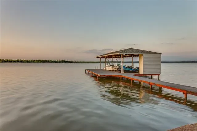 Welcome to your own private paradise nestled on a beautifully wooded 1.07-acre lot with 250 feet of lake frontage. This extraordinary property is designed for year-round enjoyment and entertaining, offering a rare combination of luxury, comfort, and outdoor recreation. A private, covered dock features a boat lift and space for two personal watercrafts, while the lakeside patio with fire pit creates the perfect spot to unwind and take in the views. Outdoors, enjoy a Gunite pool and spa located near a convenient pool bath, plus a half basketball court and basketball goal, disc golf chain basket, and a spacious separate cabana complete with a 22×21 game room and an oversized 25×13 storage garage. Inside, the home is equally impressive. The heart of the home is a chef’s kitchen outfitted with a Subzero refrigerator, gas cooktop, double ovens, microwave, island, breakfast bar, and a butler’s pantry with ample cabinetry and space for a second refrigerator. The living area showcases soaring two-story ceilings, a striking 4-sided fireplace shared with the kitchen, a wet bar, and sliding doors that lead to the covered patio. Audio is wired throughout the interior, as well as outside in the back, making it perfect for entertaining. Two dedicated offices provide flexible work-from-home spaces. The main level features two luxurious primary suites, each with its own sitting area, spa-like ensuite bath, and generous, custom walk-in closets. Additional features include a 9×5 tornado shelter located inside the home, plantation shutters, a circular driveway that enhances curb appeal, and home generator to support essential functions and ensure peace of mind. Upstairs, you’ll find three additional bedrooms, two full bathrooms, and a spacious game room, ideal for guests or family living. This is lakeside living at its finest, offering the perfect blend of seclusion, recreation, and sophistication.