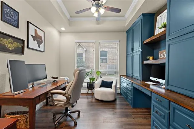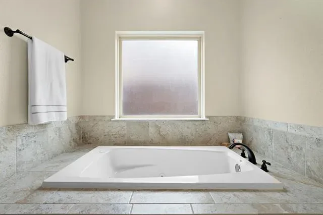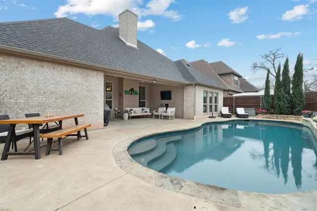 Located in the established, lakefront community of Oak Harbor Estates on Eagle Mountain Lake, 1509 Sea Breeze Ln offers private neighborhood water access with boat ramp, fishing pier and park, paired with a level of custom finishes rarely found in homes built within the same era in the neighborhood. From the moment you enter, the architectural detailing sets the tone. Crown-wrapped window and door casings, 8-foot arched openings, stained beams accenting the tray ceiling and a floor-to-ceiling stone, woodburning fireplace elevate the main living space. Custom cabinets complemented by premium granite carried seamlessly from the kitchen to the baths and even the laundry room. Custom built-ins enhance both the dedicated office and the primary suite, adding character and functionality. Plantation shutters frame the front-facing windows for a refined finish. The split floorplan offers a private primary suite at the back overlooking the pool, two secondary bedrooms with a full bath on the opposite rear wing, and a fourth bedroom with a third full bath at the front of the home. An office with solid wood stained pocket doors is located just off the entry.