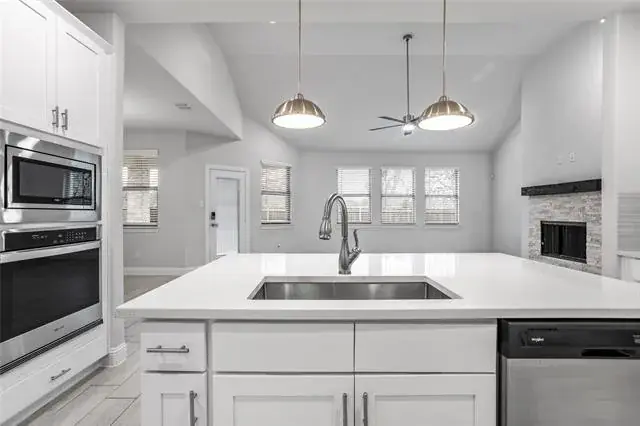 Discover modern luxury in this stunning 4-bedroom, 3-bathroom home in the sought-after Rosewood Estates neighborhood. Featuring an open-concept layout, this residence boasts high-end finishes, a chef-inspired kitchen, and two spacious living areas. The heart-of-the-home is the spacious family room, featuring dramatic 14 ft. ceilings and a cozy wood-burning fireplace that flows seamlessly into a gourmet island kitchen. Ideal for entertaining, the kitchen boasts stainless steel appliances, an electric cooktop, and an abundance of custom soft-close cabinetry and a large pantry perfect for all your storage needs. Escape to the opulent primary suite, featuring a spa-inspired bath designed for relaxation with a freestanding contemporary tub, dual sinks, separate vanity, and a large walk-in closet. Enjoy the ultimate in flexibility with a downstairs guest bedroom, featuring a nearby full bath, perfectly separated from the secondary bedrooms upstairs. Covered patio for shaded, year-round relaxation. Ideal outdoor living space perfect for entertaining, quiet mornings or pets. Conveniently designed layout with separate MUD room and laundry room to handle the day’s clothes before they ever enter the living space. Additionally, this home features a built-in pest control system, gutters and other thoughtful items to make more time for enjoying your home than worrying about it.