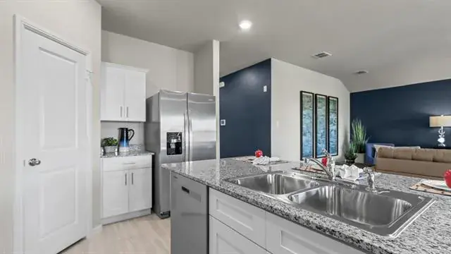 Welcome to D.R. Horton’s new community of Sandy Beach in Azle and Azle ISD! The Huntsville is a single-story home that offers 4 bedrooms, 2 bathrooms and approx 1,819 sq. ft. of living space, with an estimated Spring completion. As you enter the foyer, you’ll pass two secondary bedrooms with the spacious secondary bathroom shared between them. A short hallway off the foyer leads to the utility room and the fourth secondary bedroom. The foyer leads to a grand, open concept living room, kitchen, and dining room. The kitchen features stainless steel appliances with gas cooking range, granite countertops, a corner walk-in pantry, and a large kitchen island overlooking the living room. A large, covered patio is located off the dining room, perfect for entertaining. The private main bedroom suite is located off the dining room and features a huge walk-in closet, separate water closet and a large walk-in shower with ceramic tile surround. Additional features include: tankless water heater; Luxury vinyl flooring at Entry, Hallways (per plan), Kitchen-Breakfast, Utility and Bathrooms; and full yard sod, landscaping and irrigation. The Huntsville includes our HOME IS CONNECTED base package. Using one central hub that talks to all the devices in your home, you can control the lights, thermostat and locks, all from your cellular device.