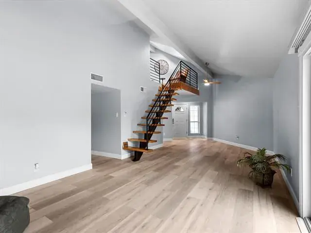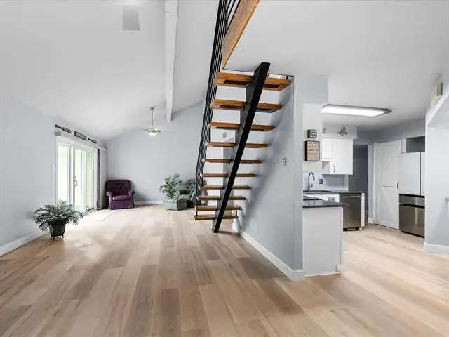 Inside, enjoy modern updates throughout: new flooring, fresh paint, quartz countertops, stainless steel appliances, and soft-close cabinetry. A bold floating staircase welcomes you in, leading to an open concept living area with abundant natural light, perfect for entertaining or relaxing.
