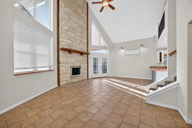 The main residence spans over 2,200 sq ft, showcasing soaring vaulted ceilings, abundant natural light, and a dramatic 30 foot Austin stone fireplace anchoring the living space. A well appointed kitchen includes dual walk-in pantries for exceptional storage. The primary suite opens to a private balcony overlooking the treetops and is complemented by a recently updated ensuite bath.