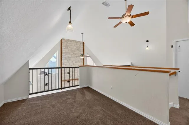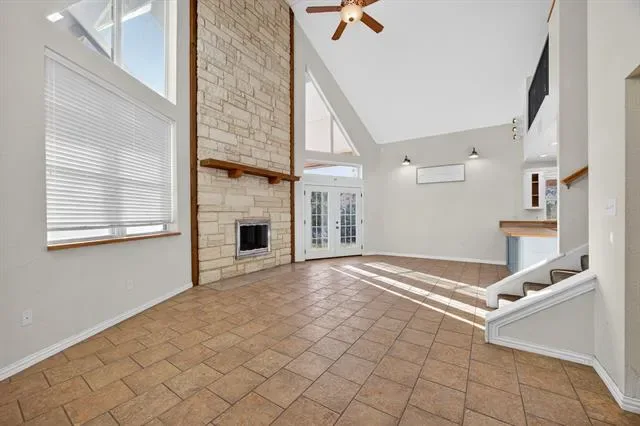 The main residence spans over 2,200 sq ft, showcasing soaring vaulted ceilings, abundant natural light, and a dramatic 30 foot Austin stone fireplace anchoring the living space. A well appointed kitchen includes dual walk-in pantries for exceptional storage. The primary suite opens to a private balcony overlooking the treetops and is complemented by a recently updated ensuite bath.