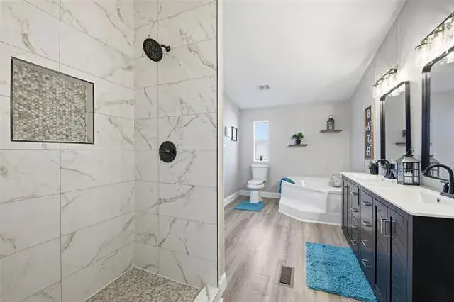 Primary suite with garden tub, large shower & walk-in closet