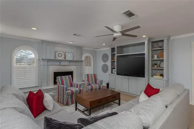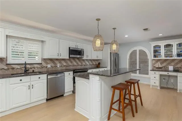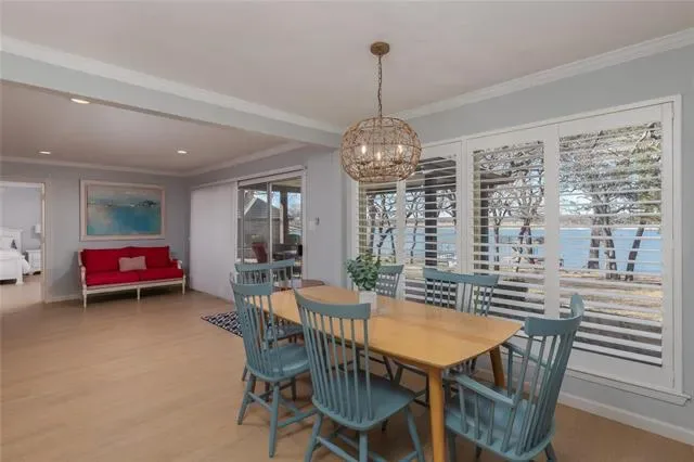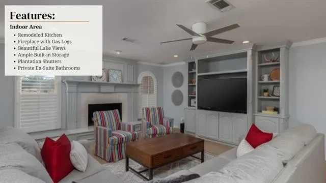 Extensively remodeled in 2021, the home blends modern updates with classic lake-house charm. Interior features include a spacious remodeled kitchen, three private en-suite bedrooms, family room with gas fireplace, built-ins and lake views, Lennox HVAC units replaced in 2024, smart water shutoff, double-pane windows, plantation shutters, abundant storage, and an epoxy-finished two-car garage.