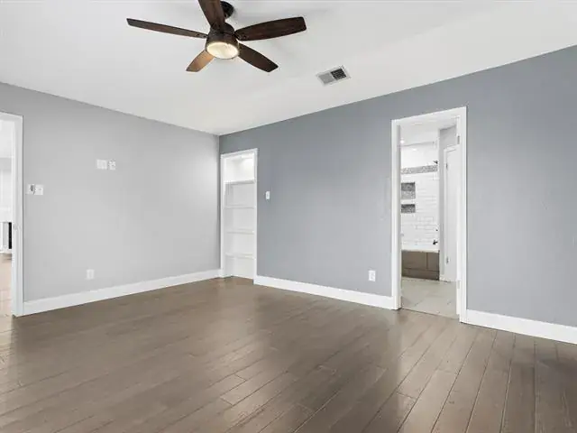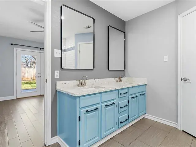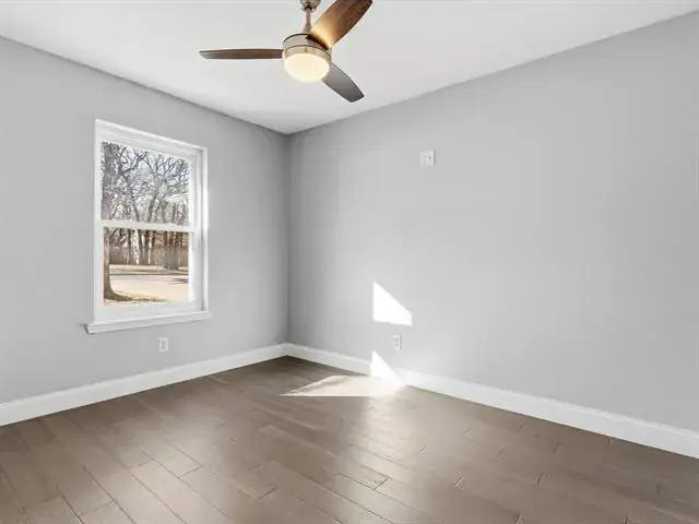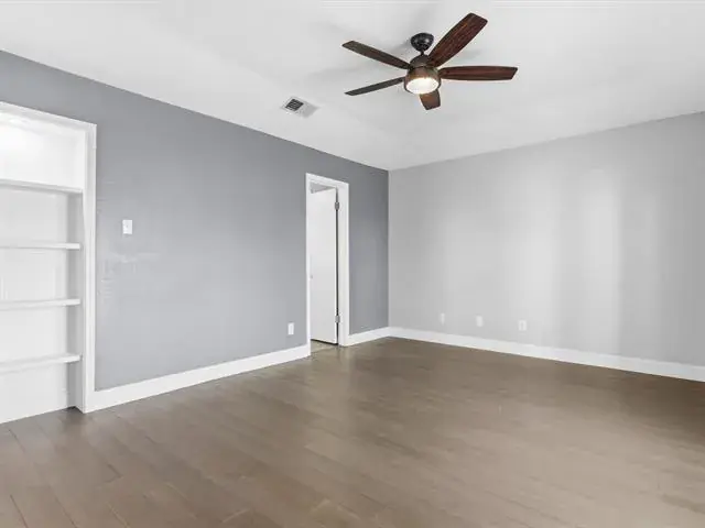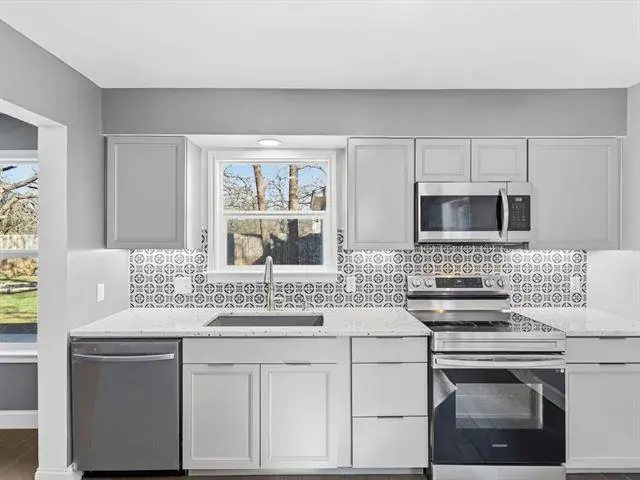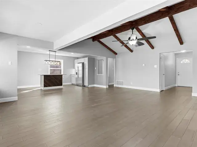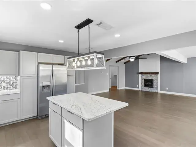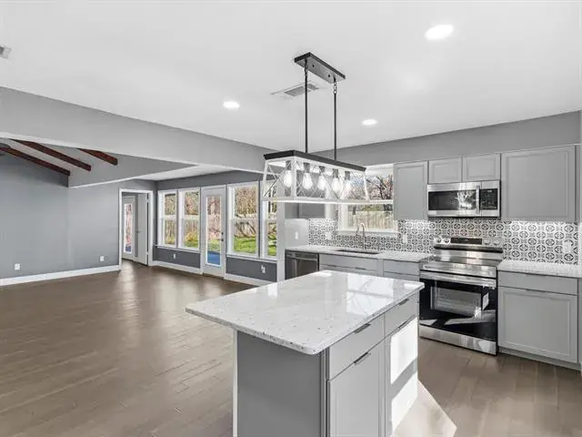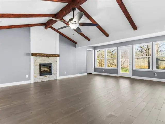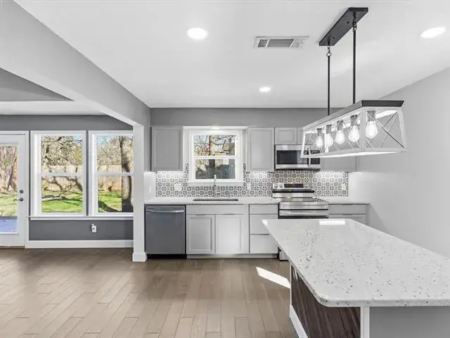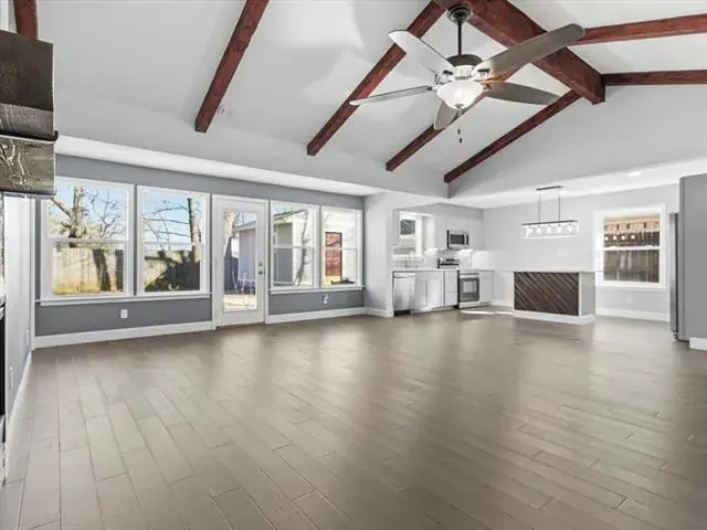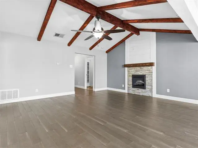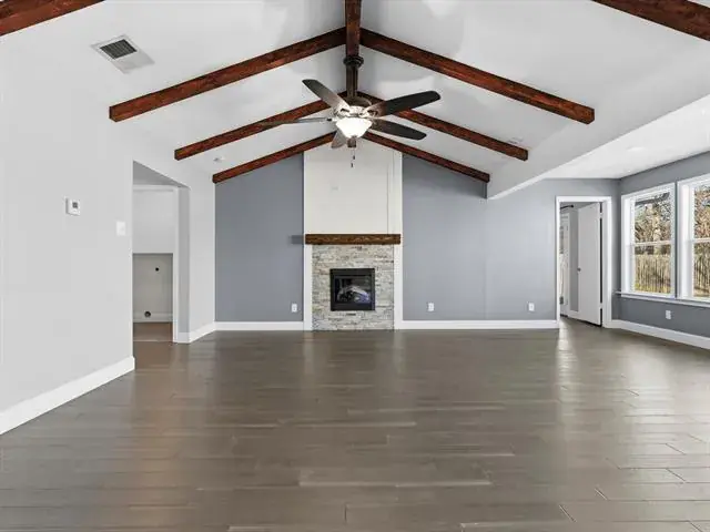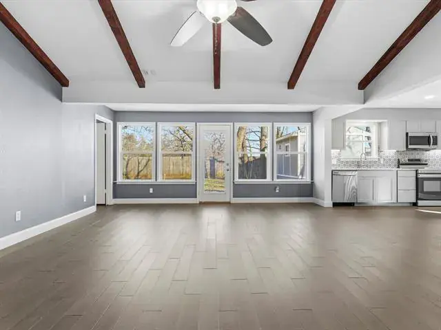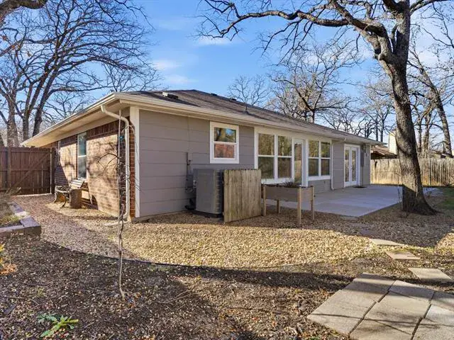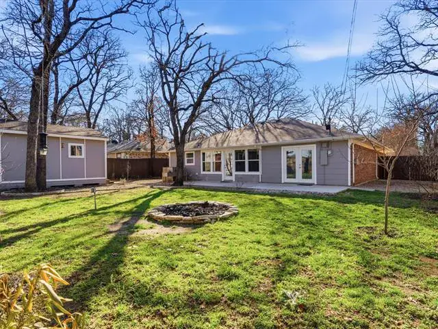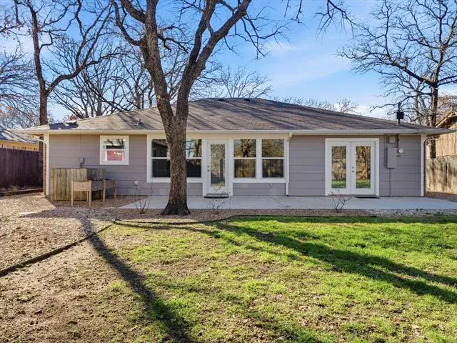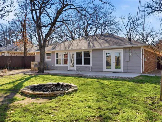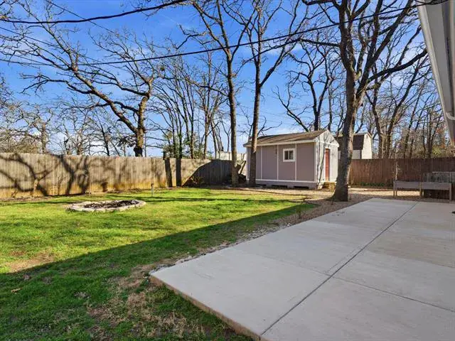 Welcome to this charming, updated single-story home that is MOVE-IN READY! Offering comfort, functionality, and a peaceful setting shaded by several mature trees. Zoned for Azle ISD and featuring easy highway access, this property also sits just a short drive from Eagle Mountain Lake. Step inside through the glass storm door to discover neutral paint tones and beautiful wood flooring flowing throughout the bedrooms and common areas. The spacious central living room is light and bright with numerous windows, a striking beamed ceiling, and a cozy electric fireplace that creates a warm focal point for gathering. The open-concept kitchen is designed to impress, showcasing updated white cabinetry, decorative backsplash, quartz countertops, stainless steel appliances, and a large eat-at island ideal for casual dining or entertaining. The private primary suite offers thoughtful touches including built-in shelving, direct access to the back patio, dual sinks in a painted vanity, a jetted tub with shower combo, and separate his-and-hers walk-in closets. Split Secondary bedrooms are well-sized, and the additional bathroom features a window for natural light and an extended countertop for extra space. Outdoors, enjoy a large open patio perfect for relaxing or hosting guests, plus a firepit for cozy evenings under the Texas sky. A 12′ x 16′ workshop with a window and utilities provides an excellent space for hobbies, projects, or additional storage. With 3 bedrooms, 2 bathrooms, a 2-car garage, and a layout designed for comfortable everyday living, this home combines charm, practicality, and location in one inviting package at a tremendous price!