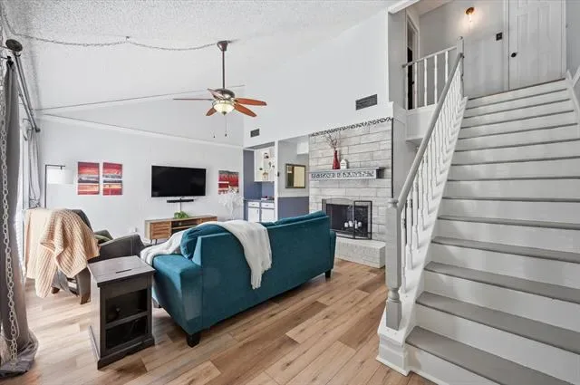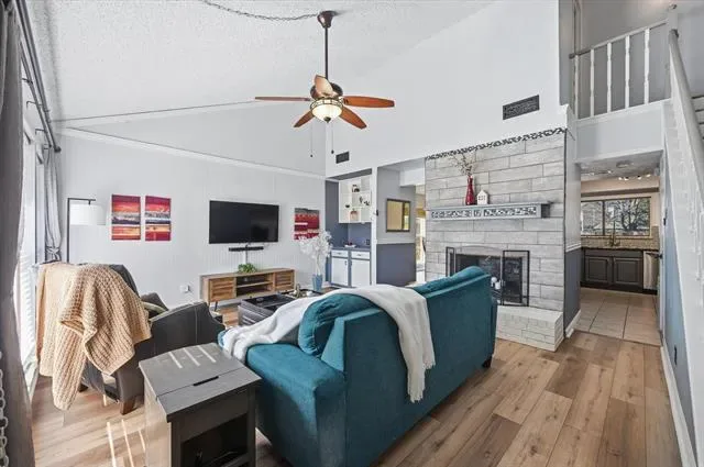 Adorable home in the perfect location! This 3 bedroom 2.5 bath home is situated on a .22 lot. Living area features vaulted ceilings and cozy wood burning fireplace. Formal dining space flows into living area. Step into the kitchen and you will find gorgeous granite countertops, lots of cabinets, eat in area and lots of natural light. Half bath downstairs perfect for guests. Dining area great for entertaining! large utility room great for extra storage. Half of the garage has been enclosed to feature a bonus room perfect for excercise room or office. Upstairs, the primary features an ensuite that has been remodeled and is adorable with walk in shower and beautiful sink and vanity. two additional rooms upstairs leaves room for everyone. Out back you will find a large backyard and a storage building for all your lawn equipment and holiday storage. This backyard is perfect for entertaining