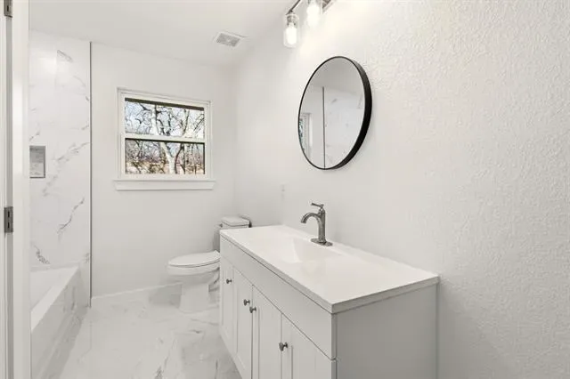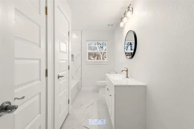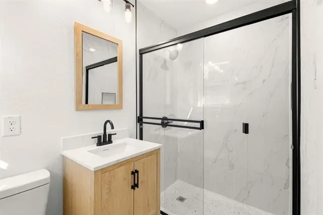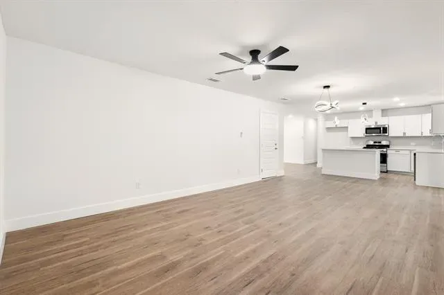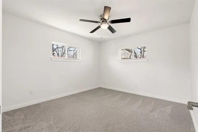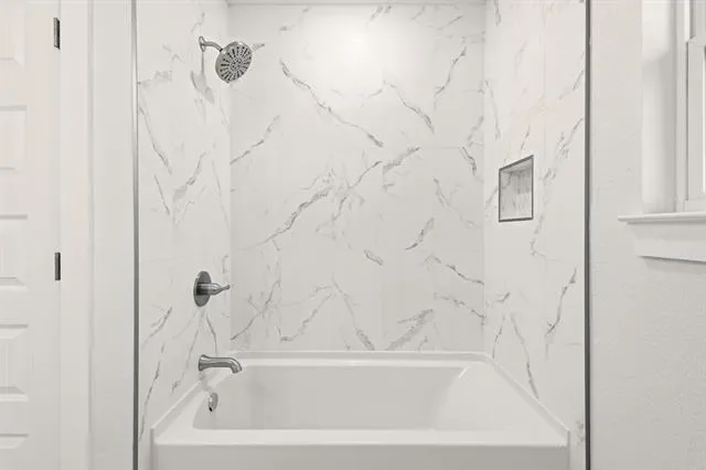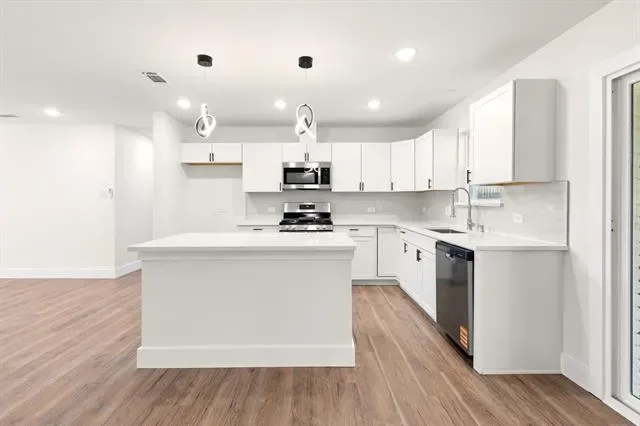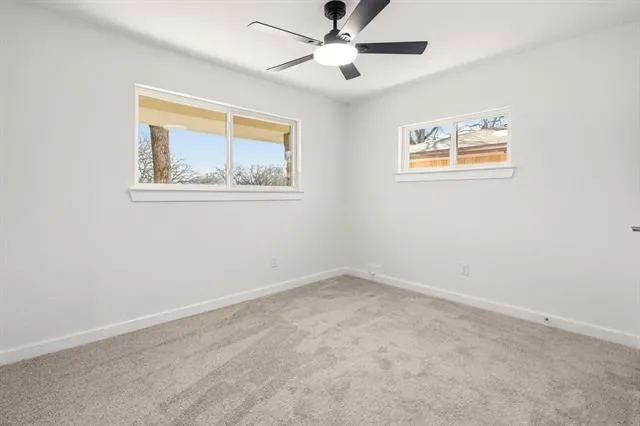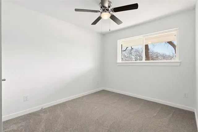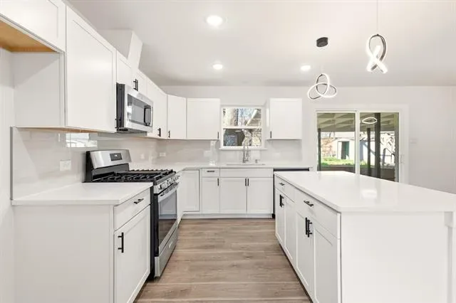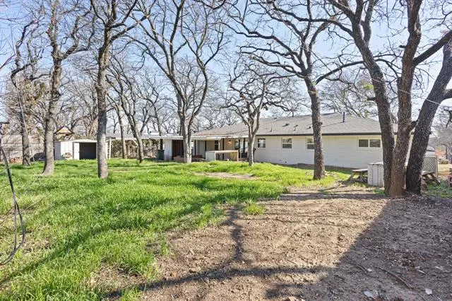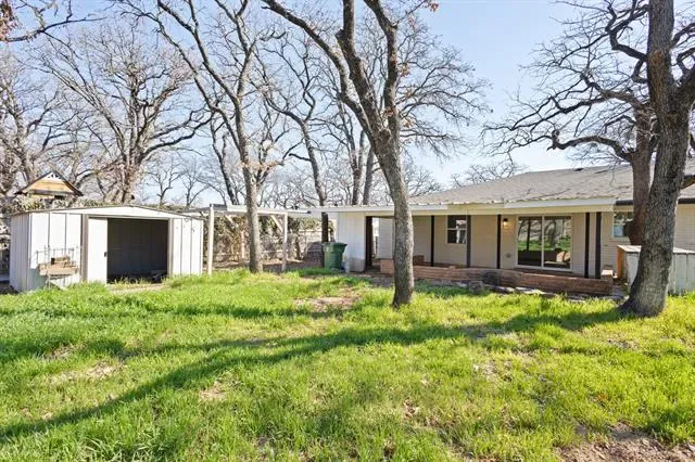Fully renovated single-story home featuring extensive updates throughout, including new flooring, sheetrock, windows, electrical, plumbing, foundation work, HVAC, and a new roof. The open layout offers a bright living area with a custom accent wall and recessed lighting. The modern kitchen showcases quartz countertops, stainless steel appliances, custom cabinetry, and a center island. Updated bathroom with sleek finishes and beautifully tiled tubshower combo. Spacious backyard with mature trees, covered patio area, and storage shed. Conveniently located near major Hwy 183 with easy access and approximately 15 minutes to downtown Fort Worth.