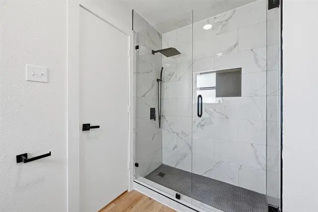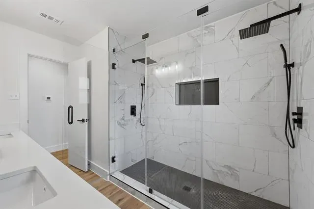 The private owner’s suite is thoughtfully separated from the three secondary bedrooms, offering a quiet retreat. The hall bathroom is a standout, showcasing an impressive walk-in shower with dual shower heads for a spa-like experience.