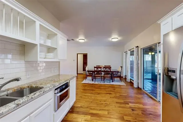 Nestled in the heart of Bedford, this meticulously maintained and thoughtfully updated Spanish-Mediterranean style home seamlessly blends timeless architectural charm with modern elegance. Recent updates include fresh interior paint throughout, brand-new carpeting, all new blinds, and beautifully updated light fixtures, creating a bright, cohesive, and truly move in ready space. The spacious layout features an oversized living area with beautiful wooden floors, large picture windows, and a seamlessly integrated built-in office space, perfect for working from home, a study, or a second living area. The light-filled formal dining space flows effortlessly into the updated eat-in kitchen, complete with a beautiful tile backsplash and warm wooden cabinetry ideal for both casual dining and entertaining. Each bedroom offers generous space and privacy, complemented by two well-appointed bathrooms. Enjoy outdoor living with a tree-shaded backyard and a fully enclosed sunroom that functions as a true extension of the home perfect as an additional living area, playroom, or flex space. Ideally located near top-rated schools, shopping, dining, and major highways, this home offers the perfect balance of beauty, comfort, and convenience.