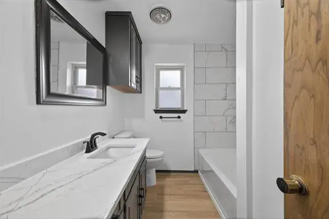 Step inside to find fresh paint, new wood look tile throughout, and plush new carpet in the bedrooms. Both bathrooms have been completely remodeled with sleek modern fixtures, quartz countertops, and porcelain marble-like tile in the showers, creating a clean, elegant spa-like feel.