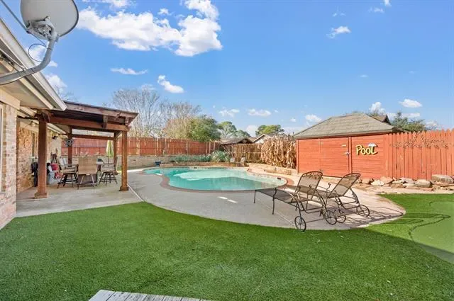 SPACIOUS & A CONVENIENT LOCATION gets CAPITALIZED HERE!! Welcome to 413 Blue Jay Court! This lovely sanctuary boasts 5 FULL bathrooms, split bedrooms with ALL walk- in closets, vaulted ceilings, a fabulous galley kitchen, separate large utility room, an outdoor covered patio with a glistening water-blue pool and a HUGE second living space, PERFECT for watching DEM COWBOYS!! The floor plan is perfect for all families big or small and ideal for the upcoming holidays when all the fam bam comes over to comfortably stay a while. You are also nestled in a cul-de-sac with very minimal traffic activity and plenty available parking space. Don’t forget you’re ONLY 15 minutes from DFW Airport!! What a STEAL of a DEAL!! The largest room in the house has a en-suite bath, currently being used for an arts and craft room but can easily be converted to a spacious guest quarters! Outside in the back yard is all TURF – no grass – with a putting green! The drive-way is large enough for a boat or RV parking. Sellers have a full house water-soft system that is negotiable with your offer. Book your showing and don’t miss this opportunity to live in the most sought out neighborhoods in the DFW metroplex.