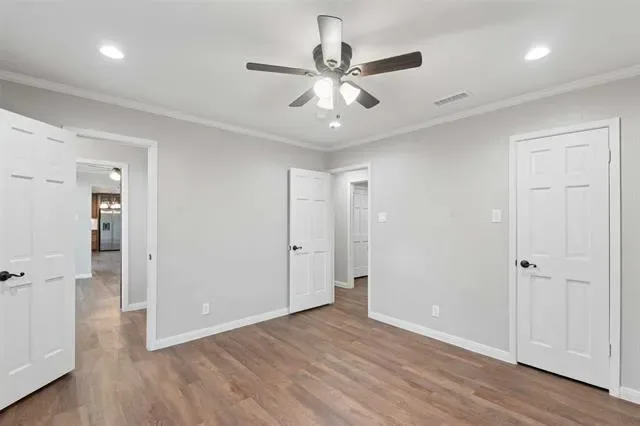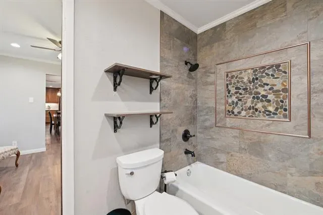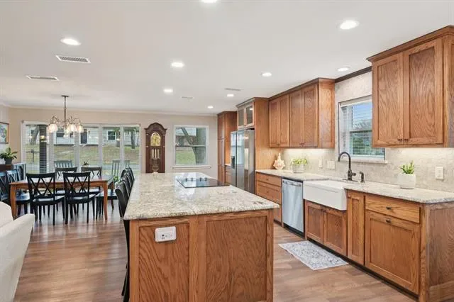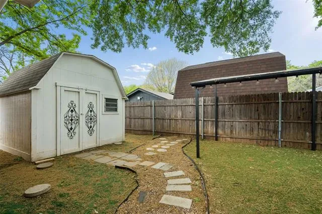 Thoughtfully designed, this fully renovated Bedford home delivers a rare combination of high-end craftsmanship, modern functionality, and effortless flow. At the heart of the home, the kitchen is a true showpiece, featuring custom solid oak cabinetry, granite countertops, and a stunning nine-foot island designed for gathering, entertaining, and everyday living. Under sink water filtration and updated appliances add both convenience and quality, while the seamless connection to surrounding spaces enhances the home’s livability.Each of the three bedrooms features custom tiled showers and built-ins. Split-bedroom layout with a private en suite bath offers ideal separation and comfort for guests or multi generational living. A dedicated office flex space adds versatility and can easily be converted back to a fourth bedroom. Electrical wiring has been updated with copper, sewer lines were tested in 2025 and iron pipes were lined with an epoxy resin coating which carries a 50 year warranty. Upgraded attic insulation, a Class 3 hail-resistant roof 2024, New double hung windows with low E glass, metal front door with Andersen storm door. The backyard is designed for ease and enjoyment with an extended covered patio, premium turf, mature shade trees, a hot tub, gazebo, storage shed, and iron gate for side entrance. Enjoy the charm of a well-established community with mature trees, minimal traffic, and the convenience of being walking distance to Generations Park Boys Ranch offering trails, green space, and a true neighborhood feel.