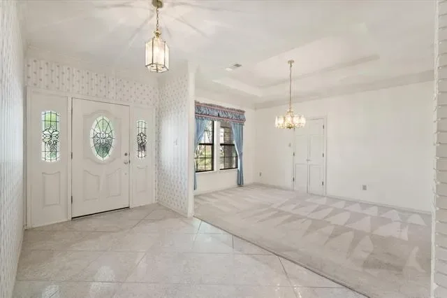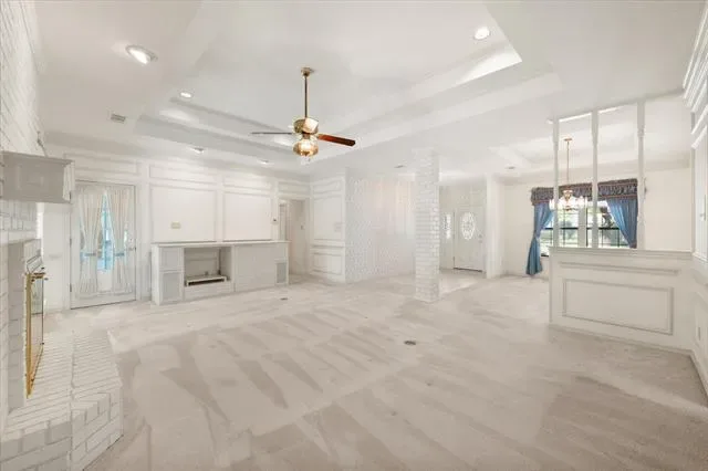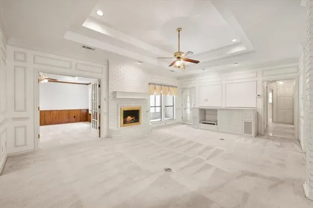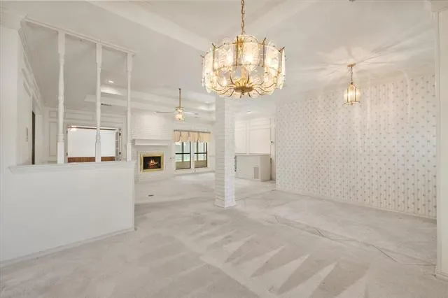 Inside, the home welcomes you with light-filled interiors and an open-concept design that was ahead of its time. Crisp white walls, a white fireplace, and pristine white carpet create a fresh, timeless aesthetic. To the left of the entry, a formal dining room is perfectly positioned for gatherings. The spacious family living area features a gas fireplace and seamless flow into the kitchen and breakfast area.