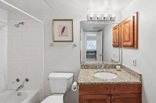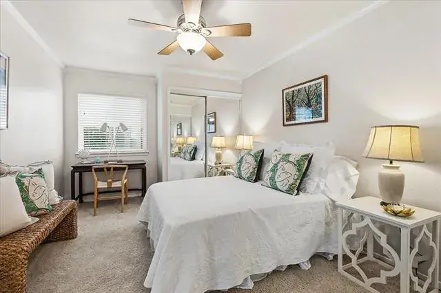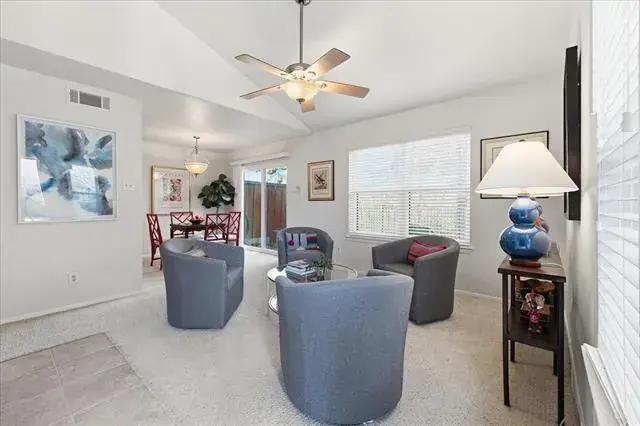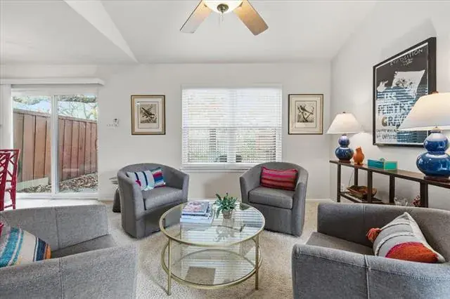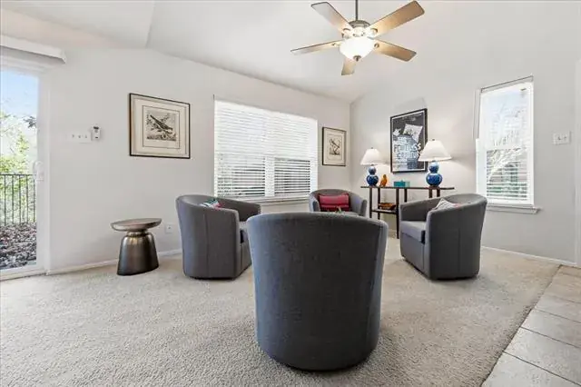 There is a primary bedroom with ensuite bath on the ground floor. If one prefers to sleep with a treetop view, there are two additional bedrooms on the second floor with a shared hallway bathroom. The washer, dryer, and refrigerator are included in the sale. There is one assigned covered parking space, with additional parking for guests. There’s also a community swimming pool and small clubhouse, and easy access to the Trinity Trail system. Convenient, low-maintenance, peaceful environment, amenities – this is a winner!