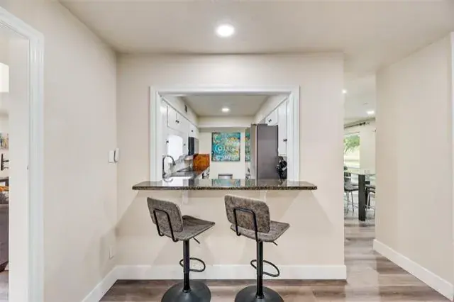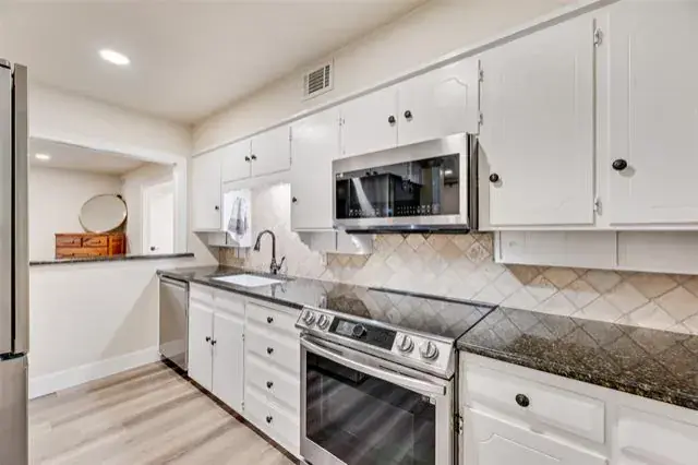 Step inside to an open and airy layout featuring new luxury vinyl plank flooring, LED can lighting, and updated stainless-steel appliances (2023). The kitchen includes granite countertops, ample cabinet space, and a breakfast bar that opens to the living room—ideal for everyday living and entertaining. A separate dining room provides additional space for hosting. Both bedrooms are generously sized with spacious bathrooms, offering privacy and convenience. Large windows fill the home with natural light, and the backyard offers a peaceful view with mature trees and glimpses of the nearby golf course. Enjoy a private front courtyard and a rear patio perfect for relaxing outdoors. While the condo has shared walls, each residence includes its own 2-car garage, adding convenience and privacy not always found in condo living. Don’t miss this opportunity to enjoy a beautifully updated home in a prime Benbrook location near Ridglea Country Club!