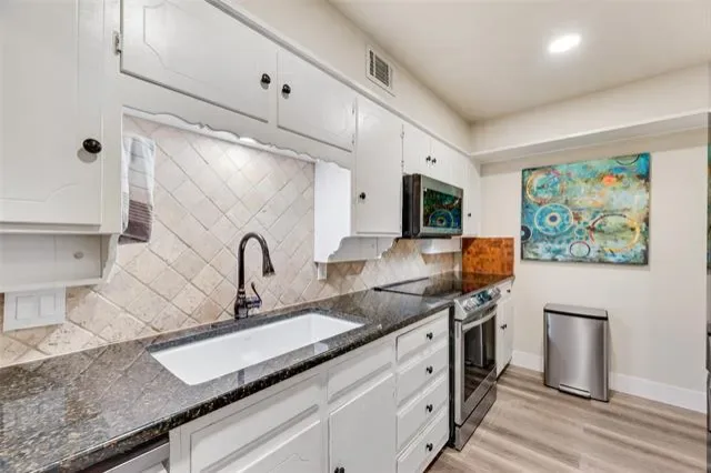 Step inside to an open and airy layout featuring new luxury vinyl plank flooring, LED can lighting, and updated stainless-steel appliances (2023). The kitchen includes granite countertops, ample cabinet space, and a breakfast bar that opens to the living room—ideal for everyday living and entertaining. A separate dining room provides additional space for hosting. Both bedrooms are generously sized with spacious bathrooms, offering privacy and convenience. Large windows fill the home with natural light, and the backyard offers a peaceful view with mature trees and glimpses of the nearby golf course. Enjoy a private front courtyard and a rear patio perfect for relaxing outdoors. While the condo has shared walls, each residence includes its own 2-car garage, adding convenience and privacy not always found in condo living. Don’t miss this opportunity to enjoy a beautifully updated home in a prime Benbrook location near Ridglea Country Club!