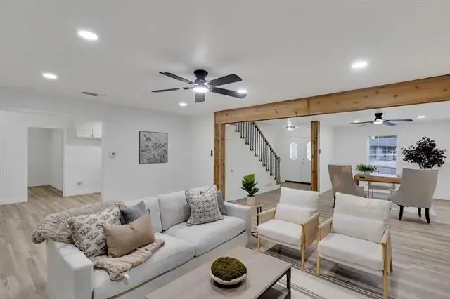 This one-of-a-kind French Country–inspired home has been thoughtfully remodeled and brought back to life. From the moment you walk in, you’ll notice the open-concept living area, highlighted by a dramatic exposed beam that draws your eye straight to the original stone fireplace—the true centerpiece of the home.