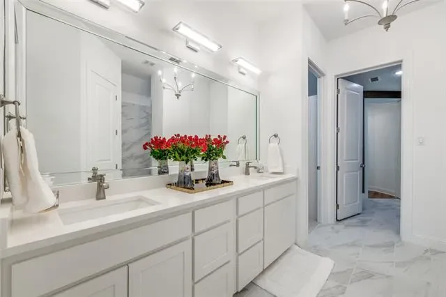 Step inside to discover tall ceilings, a family room with a full-size gas-burning fireplace, and a light-filled interior enhanced by solar window tint on all windows. The gourmet kitchen is a chef’s dream featuring quartz countertops, gas range, cabinet-faced refrigerator, custom cabinetry to the ceiling, a full island with cabinetry and elegant hardware, and stainless steel appliances.