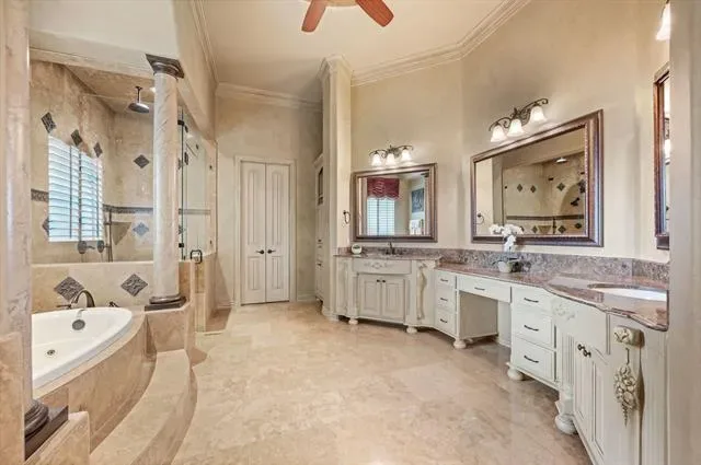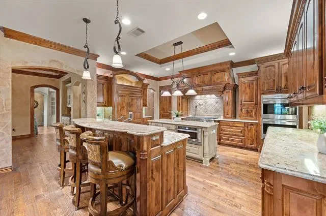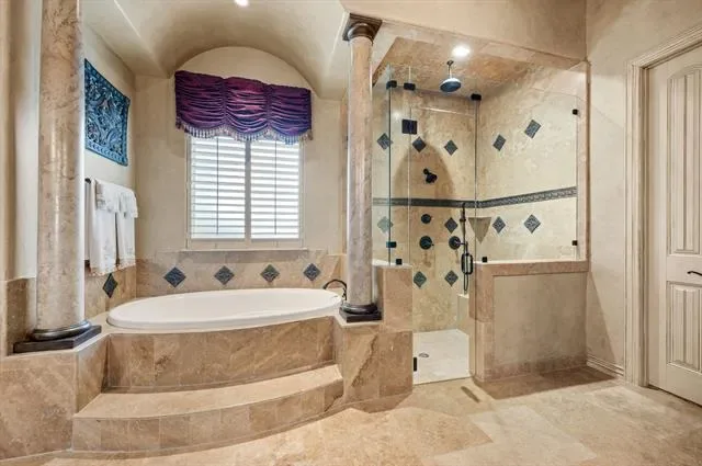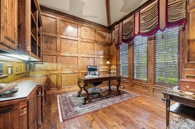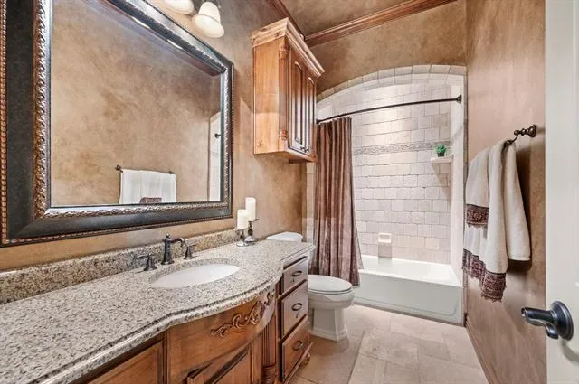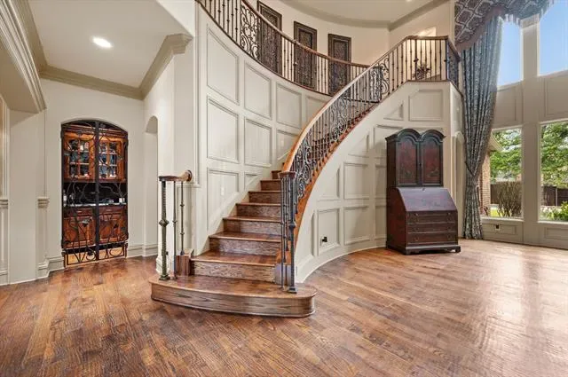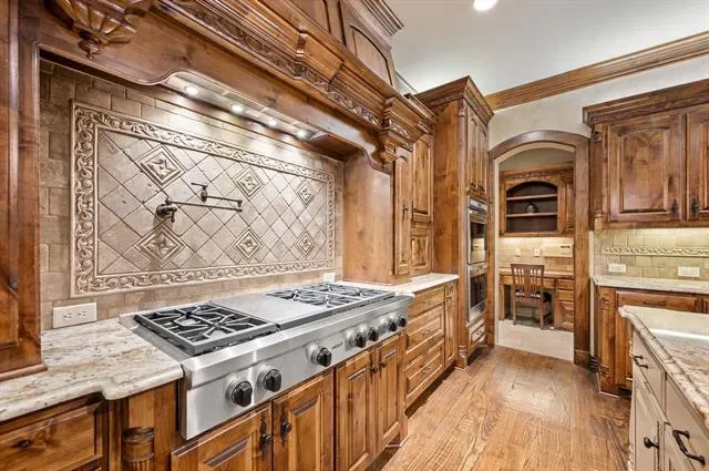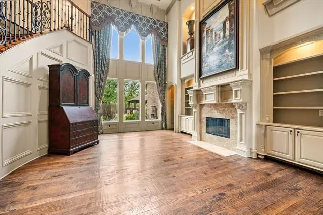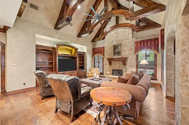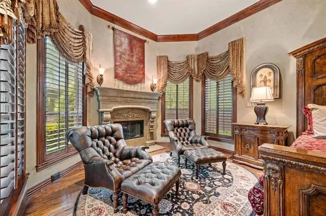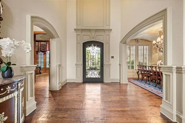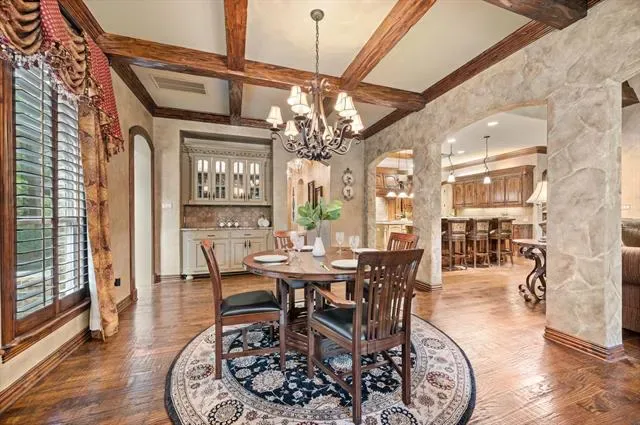 Luxury finishes while keeping warm, cozy spaces, custom constructed with uncommon quality and craftsmanship throughout. This 5BR, 5.5 BA home on .49 acres is located in charming Colleyville. Impressive courtyard entry through a wrought iron gate with bubbling fountain and flower gardens. Architectural details on display include massive beams, custom millwork, 5 fireplaces, curved staircase, wainscoting, stonework and more! Statement finishes you must see to appreciate. Formal dining and living rooms greet you upon entering with soaring encased windows allowing abundant natural light and views to the pool and backyard. Admire the culinary kitchen with Wolf-Subzero appliances, granite tops, 6 burner gas cooktop, pot filler, large island, drawer microwave, instant hot water, and pocket office adjacent. Great sight lines from kitchen into the XL breakfast area and