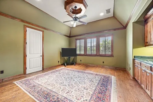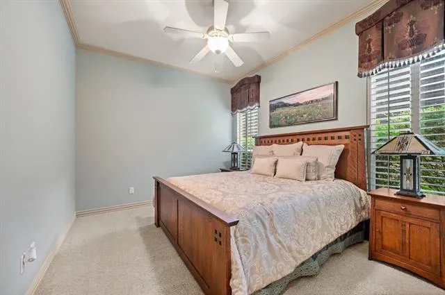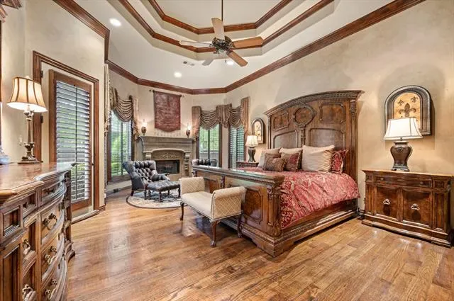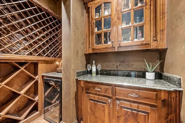 casual living area and soaring stone fireplace. Pour and sip from your wine and whiskey room. Primary suite is down as well as a split private guest BR & BA. Primary is a welcoming retreat with fireplace and sitting area. A curved staircase leads to 3BRs upstairs, all with ensuite baths. Additional flex living space upstairs can be used as a den, Gameroom, workout space or second office. Journey outside to covered porches, stone fireplace, outdoor grilling center, cabana, and sparkling pool that is heated and has a chiller for Texas summers! Quick access to DFW airport, restaurants, retail and zoned to GCISD. Tornado shelter built into the 4 car garage floor! Beautiful landscaping! Storage everywhere! Come see this beautiful home and make it yours!