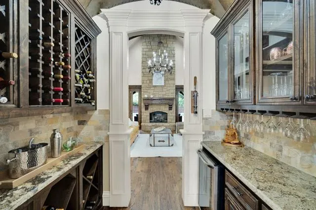 Built-in Wine Cooler, Cathedral Ceiling(s), Chandelier, Decorative Lighting, Eat-in Kitchen, Granite Counters, High Speed Internet Available, Kitchen Island, Multiple Staircases, Natural Woodwork, Open Floorplan, Pantry, Vaulted Ceiling(s), Wainscoting, Walk- In Closet(s), Wet Bar