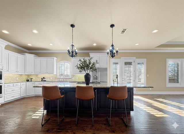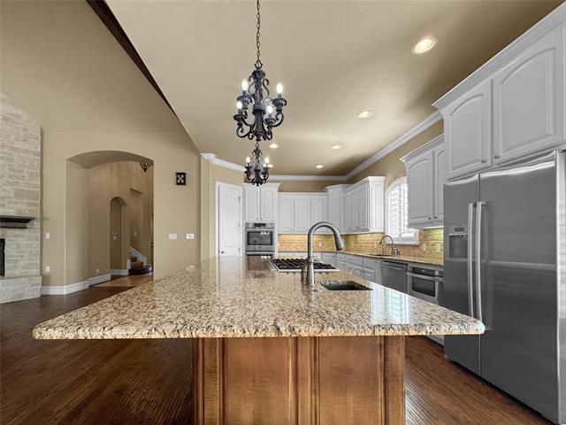 Timeless Luxury. Confident Living. Located within the gated Copperglen community, this gorgeous home blends timeless design with thoughtful functionality in one of Colleyville’s most desirable settings. A dramatic rotunda-covered porch leads to arched foyer with elegant lighting opens to travertine &' wood flooring, custom wood shutters throughout, setting the tone for refined living. A private study (optional 4th bedroom) features hardwood flooring, custom wood-trimmed windows, and wood shutters—an ideal space for work or a quiet retreat. The home’s living areas flow effortlessly toward the rear, where expansive glass doors connect the interior to a covered outdoor living area with a fireplace, creating seamless indoor-outdoor enjoyment. The kitchen showcases custom cabinetry with undermount lighting, granite countertops, custom cabinetry, tile backsplash, and a built-in Bosch double oven, offering both style and functionality. Adjacent utility space includes granite counters, ample cabinetry, and dedicated appliance connections for everyday convenience. The beautiful custom builtin China hutch is adorned with undermount cabinetry lighting.