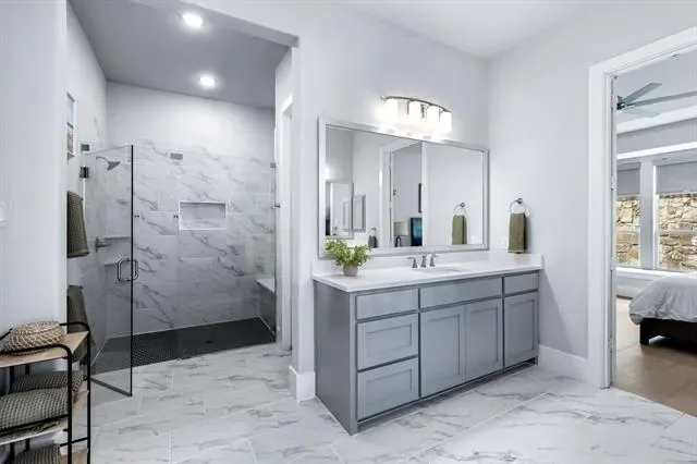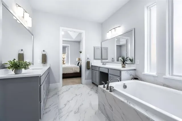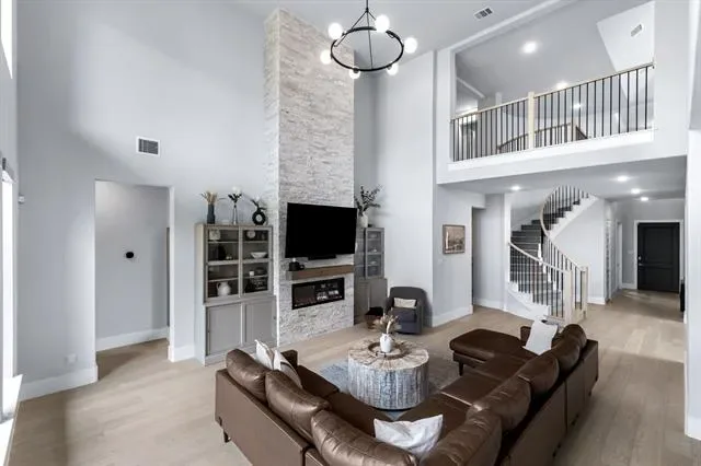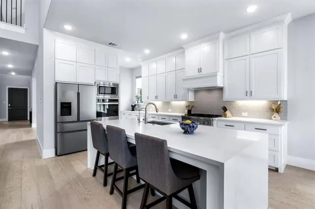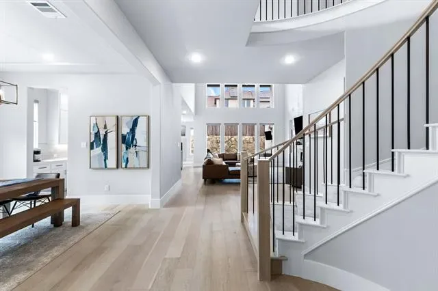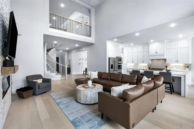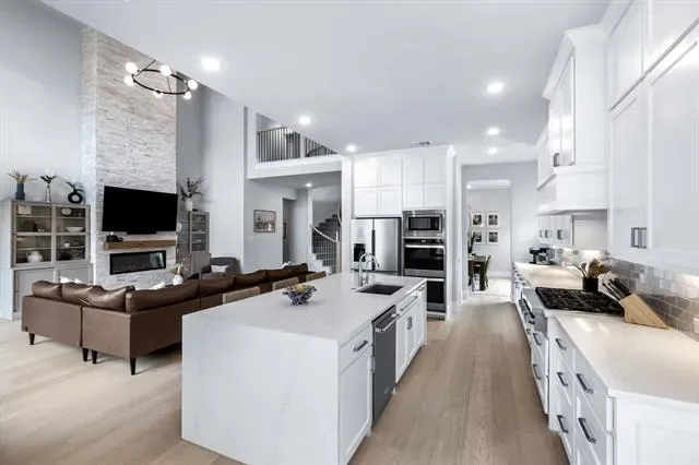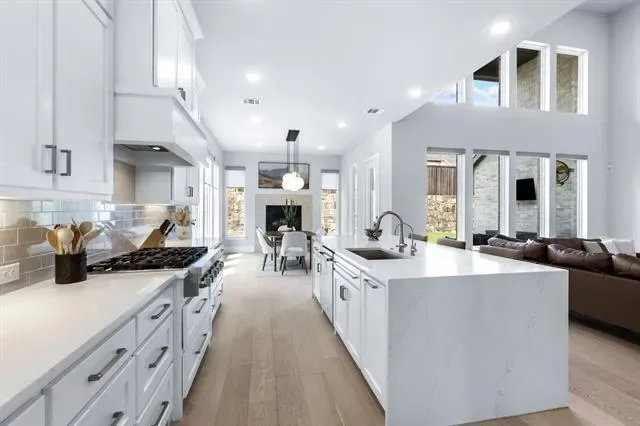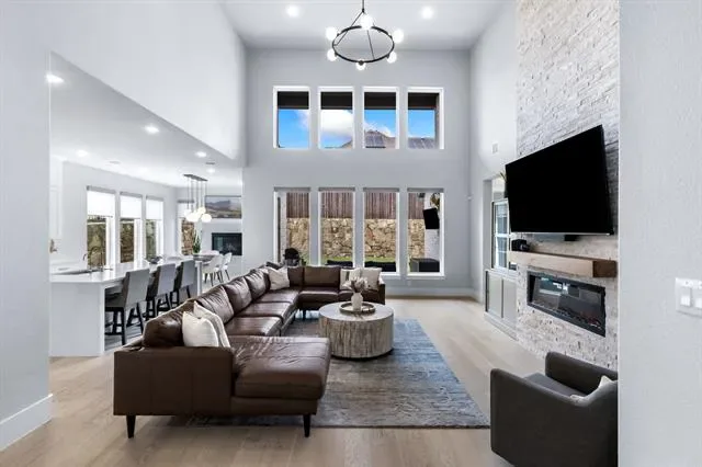 Welcome to 4000 Campania Court in the highly sought-after Creekside at Colleyville gated community, where modern luxury meets light, bright living. This beautifully maintained 4-bedroom, 5-bathroom home offers soaring 20-foot ceilings and an airy open layout that makes a statement from the moment you walk in. The grand entry flows into a stunning living space filled with natural light, oversized windows, and high-end finishes throughout, including a dramatic floor-to-ceiling stone fireplace with custom built-ins and designer touches that elevate the entire home. The chef’s kitchen is the heart of the home, featuring a large island, commercial-grade range, double ovens, butler’s pantry, walk-in pantry, and elegant quartz countertops—perfect for both everyday living and entertaining. A dedicated home office downstairs provides the ideal space for working from home or a quiet private study, while an additional first-floor ensuite bedroom offers excellent flexibility for guests or multigenerational living. The spacious first-floor master suite is a true retreat with a spa-like bath, dual vanities, soaking tub, separate shower, and oversized walk-in closet. Upstairs you’ll find a spacious game room, two secondary bedrooms with ensuite baths, a theatre room, and a dedicated home gym, offering incredible flexibility for both everyday living and entertaining. Thoughtful recent upgrades totaling approximately $60,000 include whole-home water filtration, HVAC and ducting improvements, UV air quality enhancements, extended stamped concrete patio space, backyard drainage improvements, and fresh landscaping. The 3-car tandem garage adds extra storage and functionality, while the gated community and prime Colleyville location provide convenience, privacy, and easy access to shopping, dining, and DFW Airport—offering the perfect blend of luxury, comfort, and everyday livability in one of Colleyville’s most desirable neighborhoods.