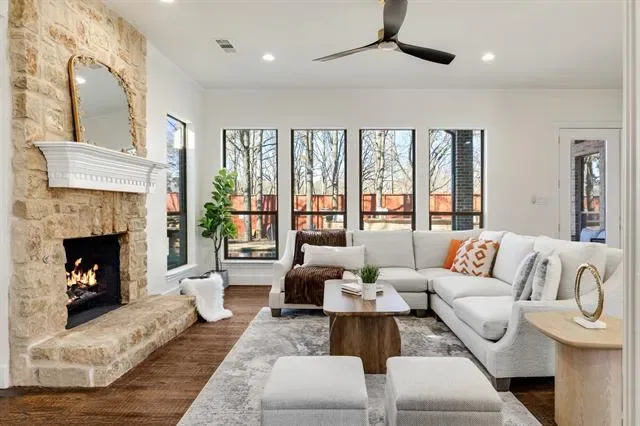 The chef’s kitchen is thoughtfully designed for both daily living and hosting, complete with Taj Mahal quartzite countertops, custom white cabinetry, Sub-Zero refrigeration, Wolf appliances, and an oversized island with seating. The spacious family room is anchored by a striking floor-to-ceiling stone fireplace and flows seamlessly into the kitchen and breakfast area. All 3 living spaces overlook the stunning backyard and pool.